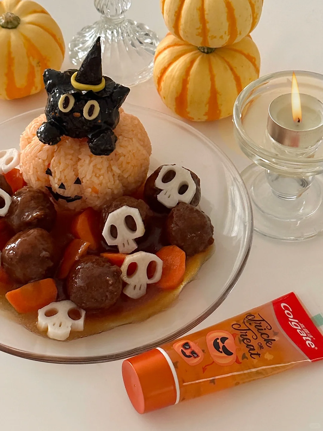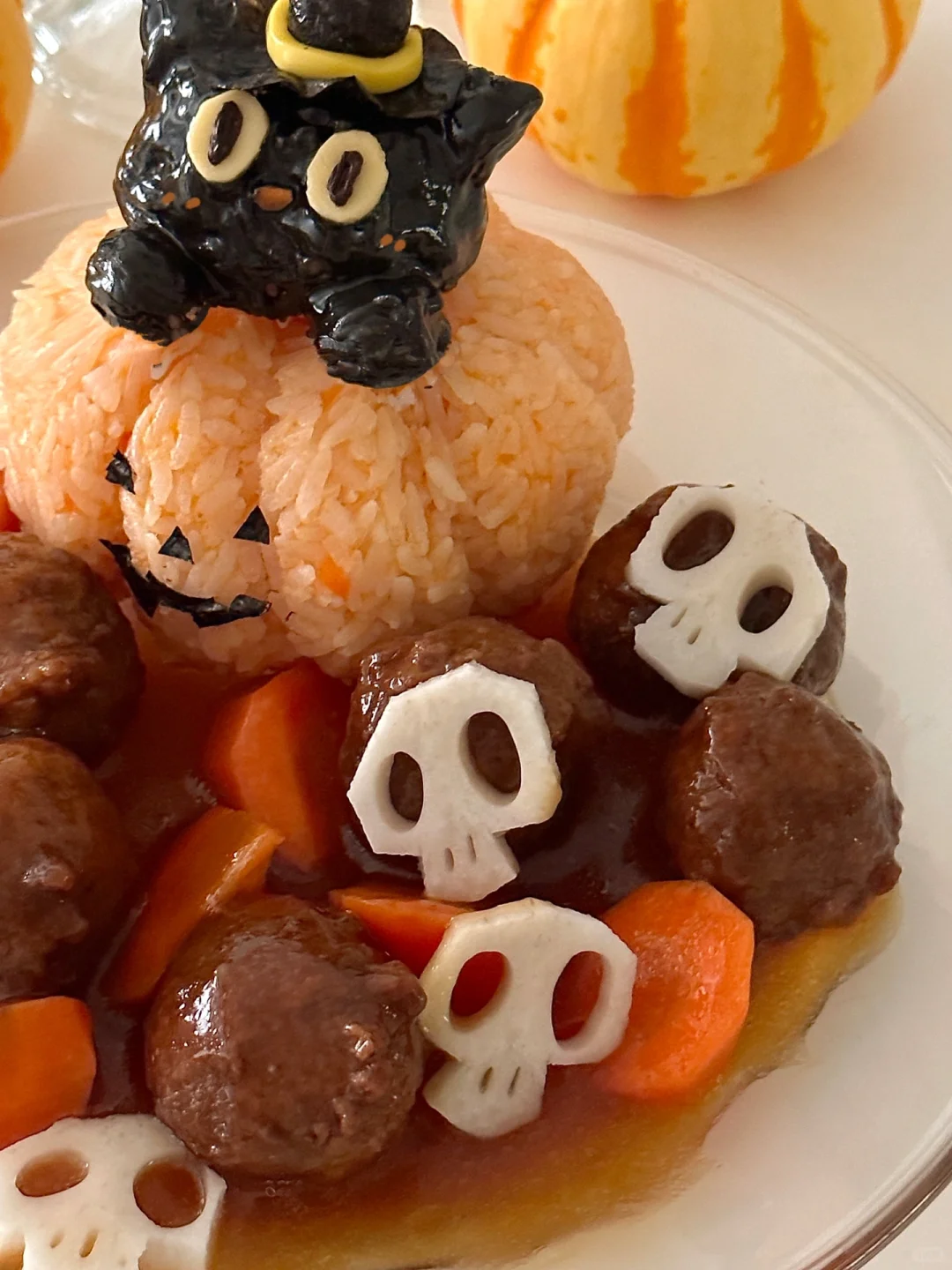 脑子里瞬间来了灵感,也制作了南瓜色系的万圣节美食,可爱黑猫南瓜万圣节咖喱肉丸套餐!