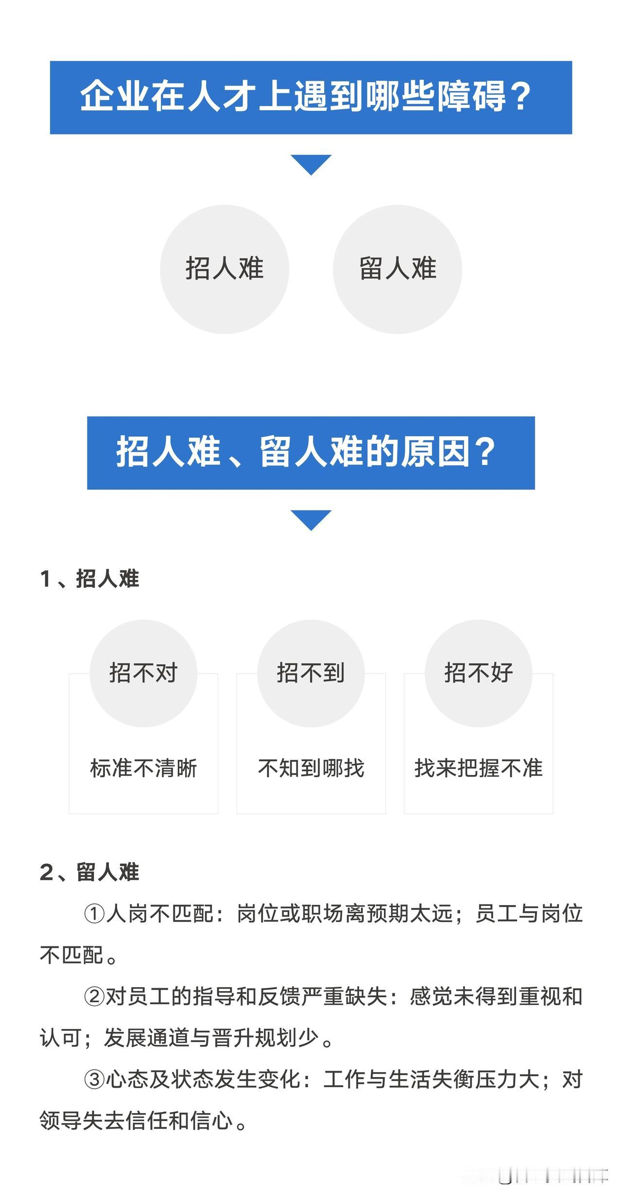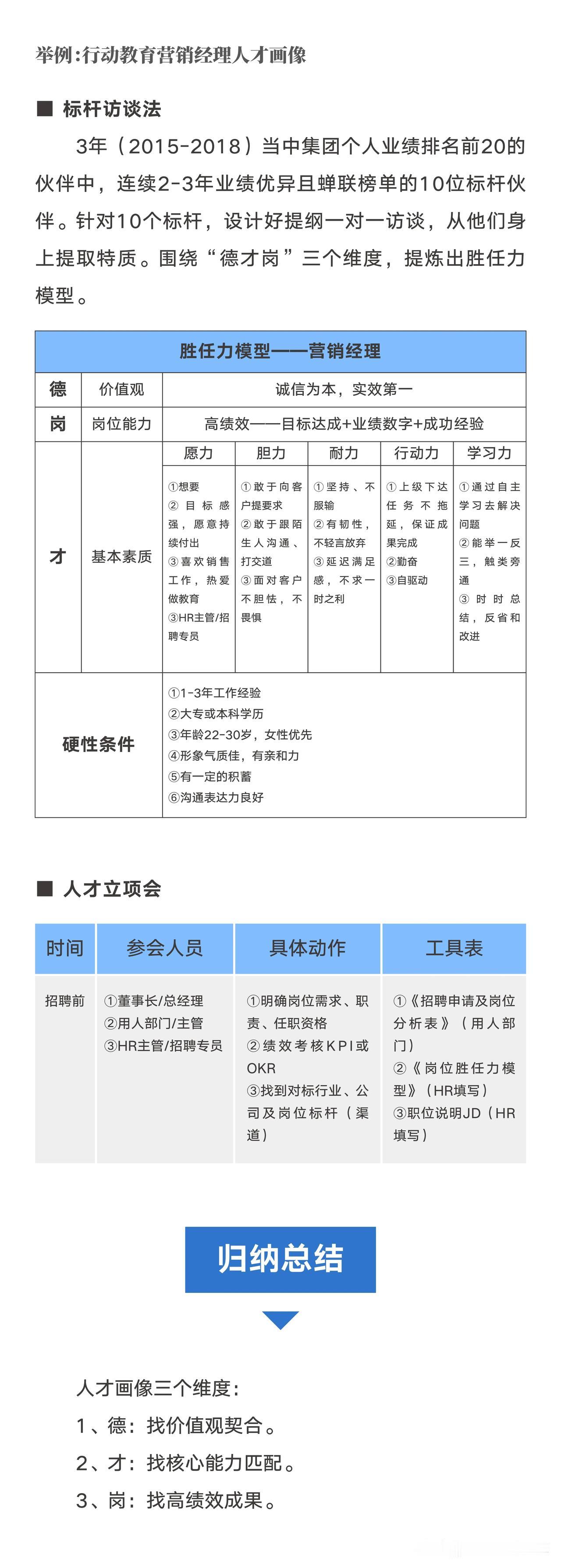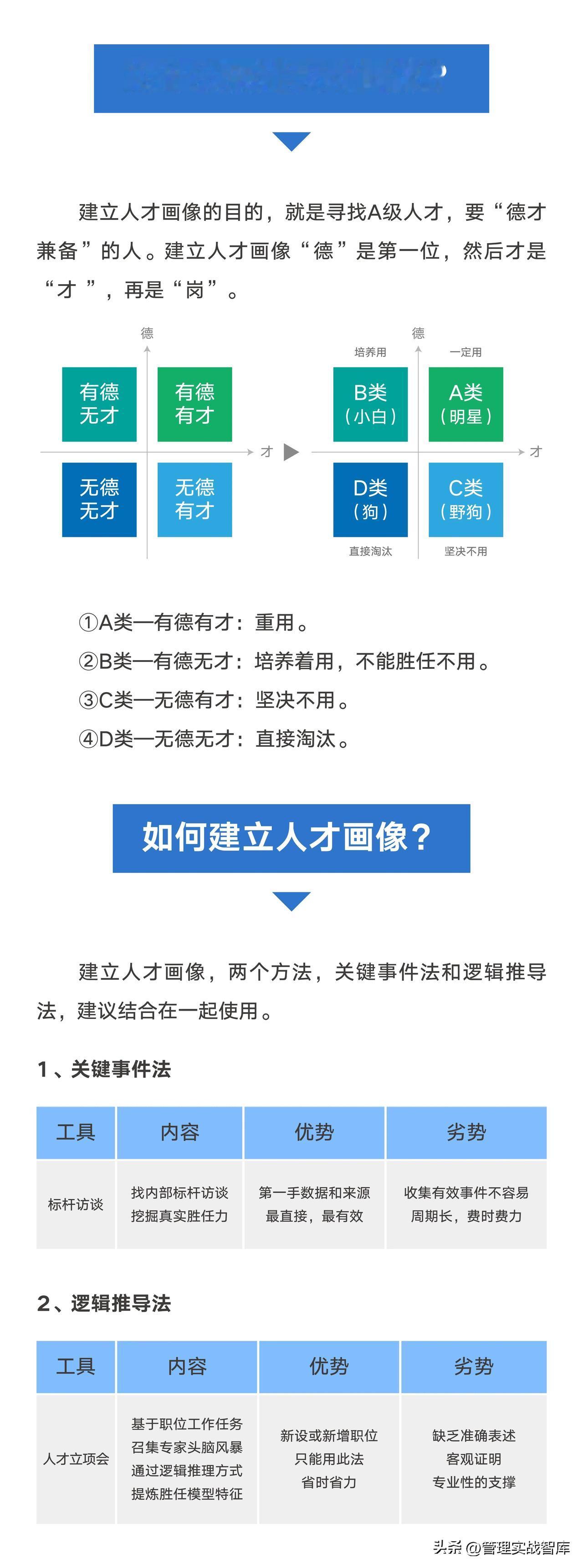 【人才战略之人才画像】 企业在人才上遇到哪些障碍? ——招人难+留人难 招人难、留人难的原因? 1、招人难 招不对-标准不清晰 招不到-不知到哪找 招不好-找来把握不准 2、留人难 ①人岗不匹配:岗位或职场离预期太远;员工与岗位不匹配。 ②对员工的指导和反馈严重缺失:感觉未得到重视和认可;发展通道与晋升规划少。 ③心态及状态发生变化:工作与生活失衡压力大;对领导失去信任和信心。 什么是人才画像? 人才画像就是我们在招聘前要建立一个标准,这个标准就是胜任力模型。 ①德:价值观。选人的时候,不能光考虑是否胜任这个岗位,还需要思考与组织文化的匹配,看看是否是同一路人。 ②才:核心能力。要用人所长,看他们的一技之长在哪,优势、特长、亮点、核心竞争力。 ③岗:高绩效。在这个岗位上取得的成果,这个成果是有效益、收益的结果。 为什么要建人才画像? 建立人才画像的目的,就是寻找A级人才,要“德才兼备”的人。建立人才画像“德”是第一位,然后才是“才 ”,再是“岗”。 A类—有德有才:重用。 B类—有德无才:培养着用,不能胜任不用。 C类—无德有才:坚决不用。 D类—无德无才:直接淘汰。 如何建立人才画像? 建立人才画像,两个方法,关键事件法和逻辑推导法,建议结合在一起使用。