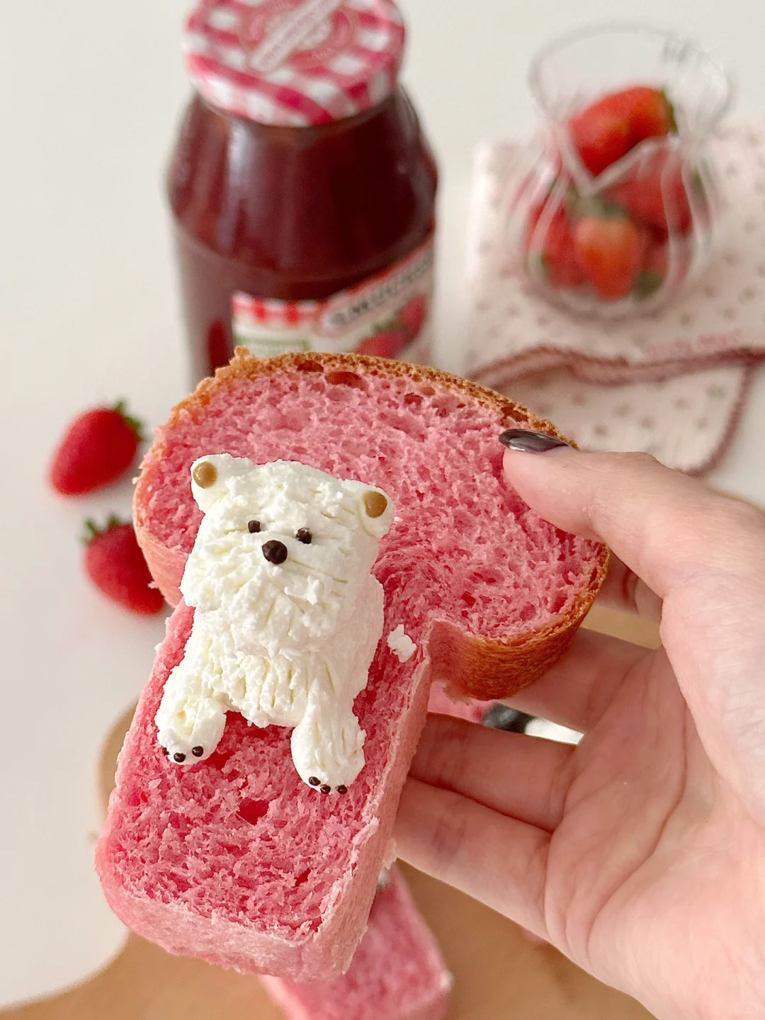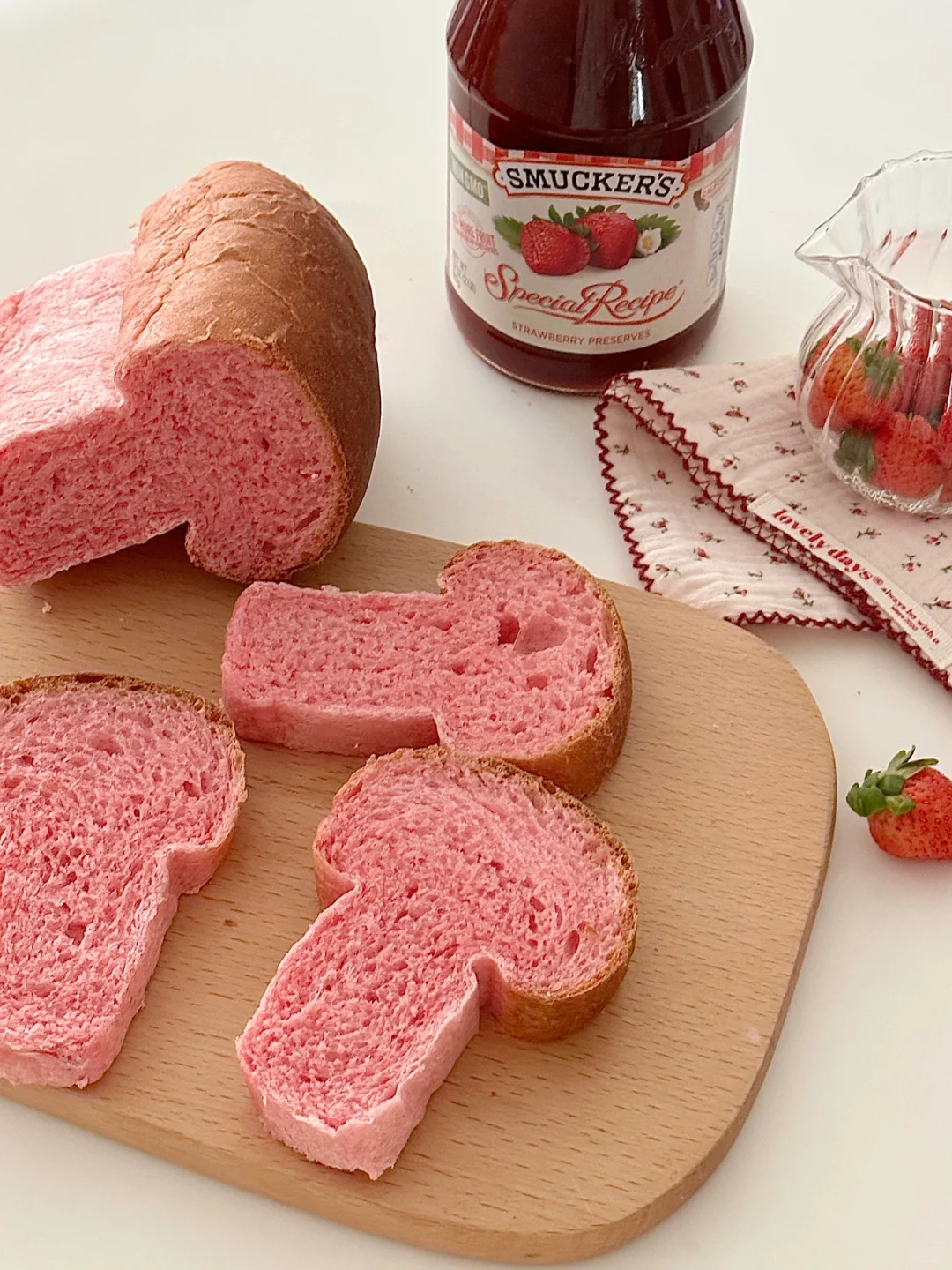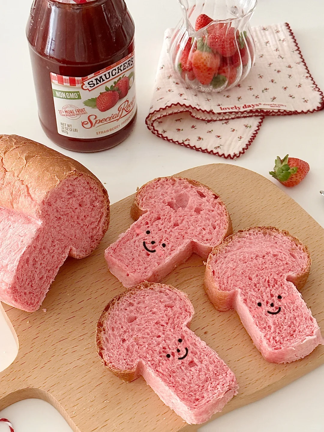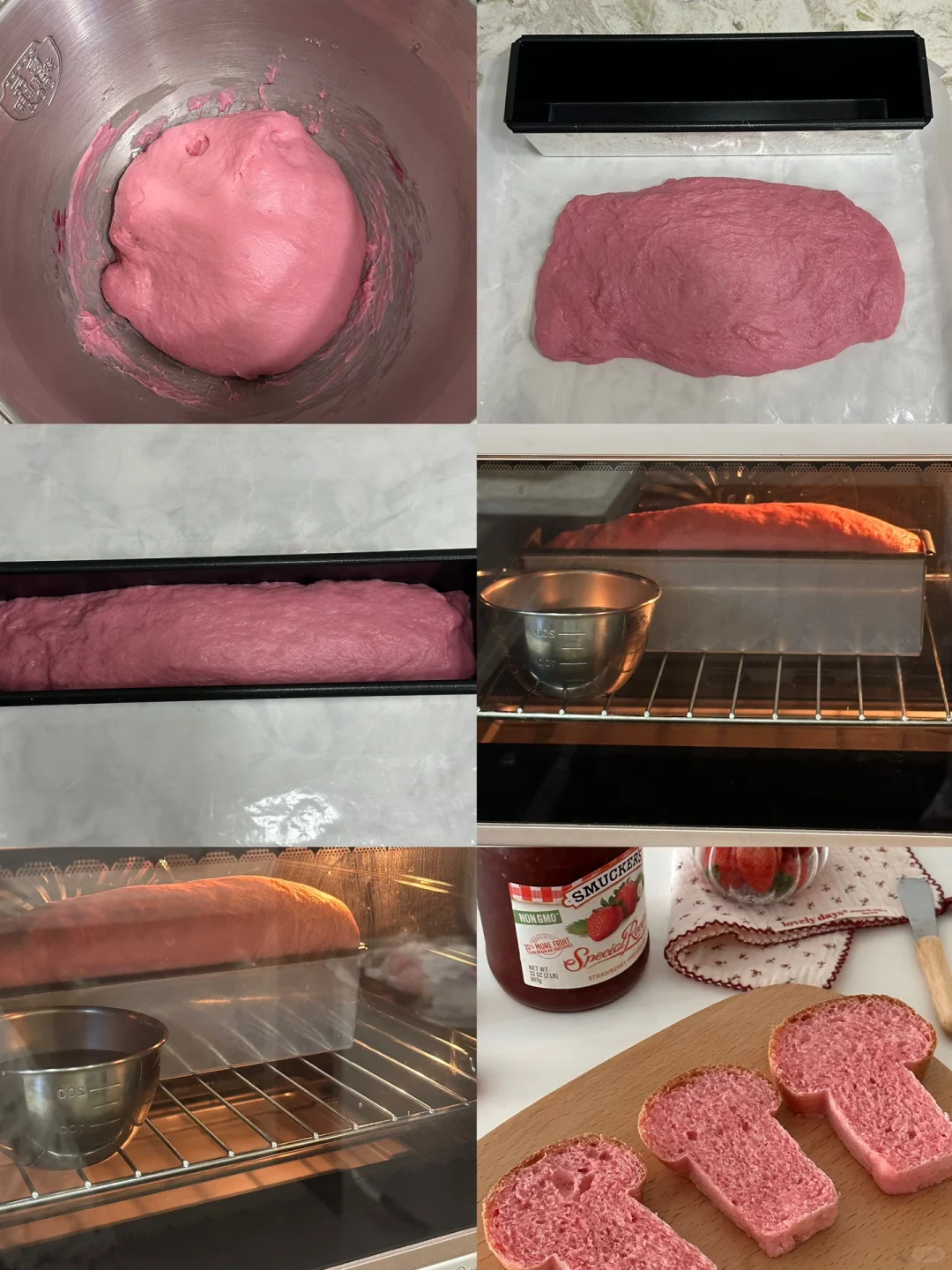 草莓脑袋烤了蘑菇头吐司,搭配草莓果酱乳酪,完美的下午茶搞定![哇R] 所需材料: 高筋面粉 250g,水150g,耐高糖酵母 3g,黄油 20g,白砂糖 30g,盐 3g,仙人掌果粉一丢丢 制作步骤: ①混合除黄油以外的材料,厨师机低速搅打至有厚膜 ②加入室温软化好的黄油,厨师机高速继续搅打至有薄膜 ③室温发酵1小时 ④发酵好的面团排气整形成模具同样长度的面团 ⑤烤箱发酵32°一小时(记得放一碗温水) ⑥上火175°下火200°预热烤25分钟,最后七分钟加盖锡纸防止过度上色。