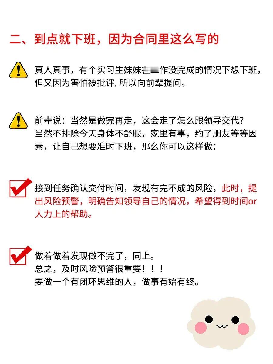 ‼举例👉有个实习生妹妹在工作没完成的情况下想下班,但又因为害怕被批评,所以向前辈提问。
