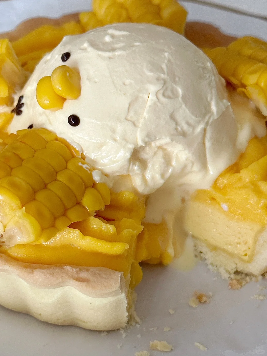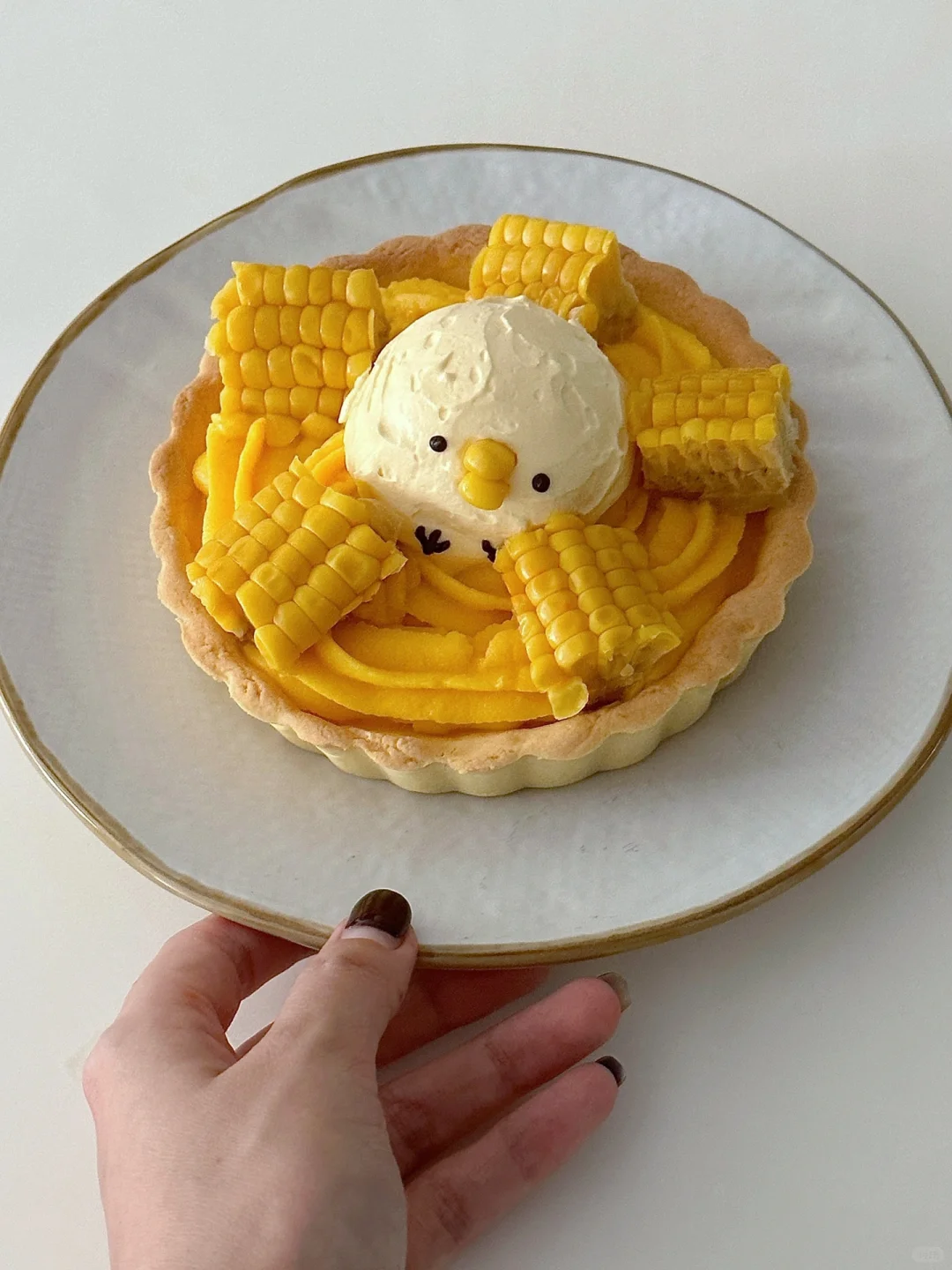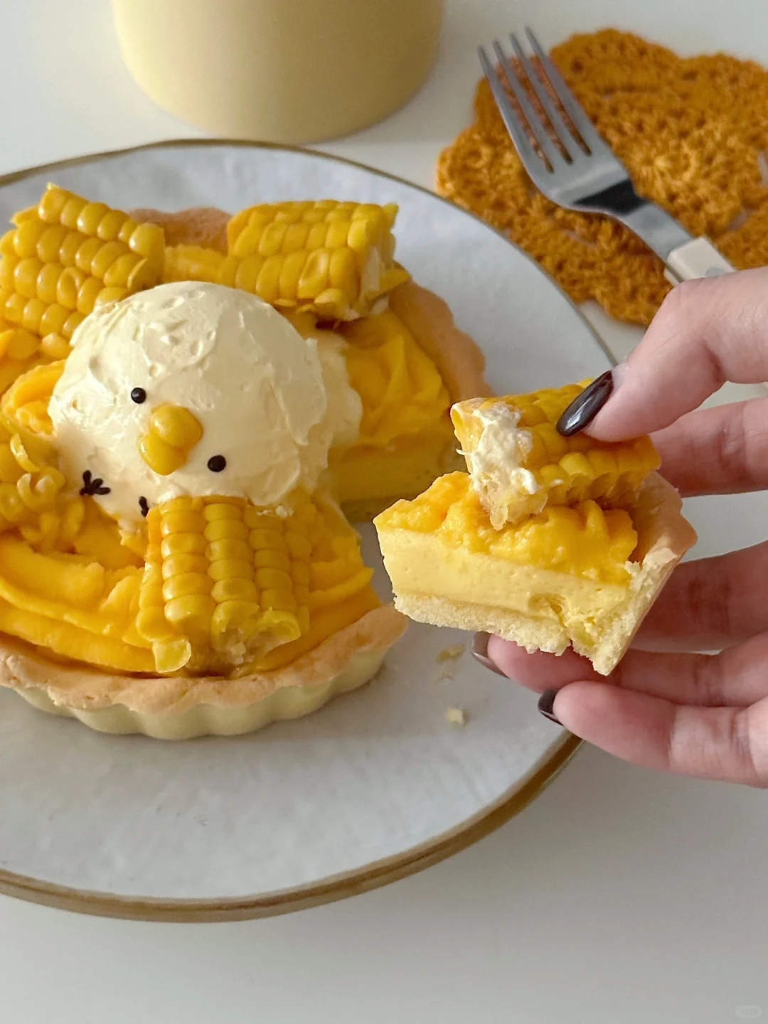 内馅儿是烘烤出的duáng duáng的奶香玉米布丁层[哇R],铺上一层厚厚的玉米卡仕达酱,搭配玉米咸奶油小鸡~简直是玉米脑袋的福音[黄色心形R][黄色心形R][黄色心形R][哇R]