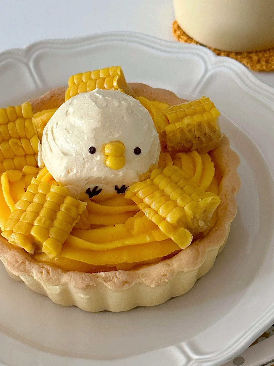⑦打发好的玉米奶油用冰淇淋勺子挖球放正中间用玉米粒做小鸡嘴巴,巧克力挤出眼睛脚丫