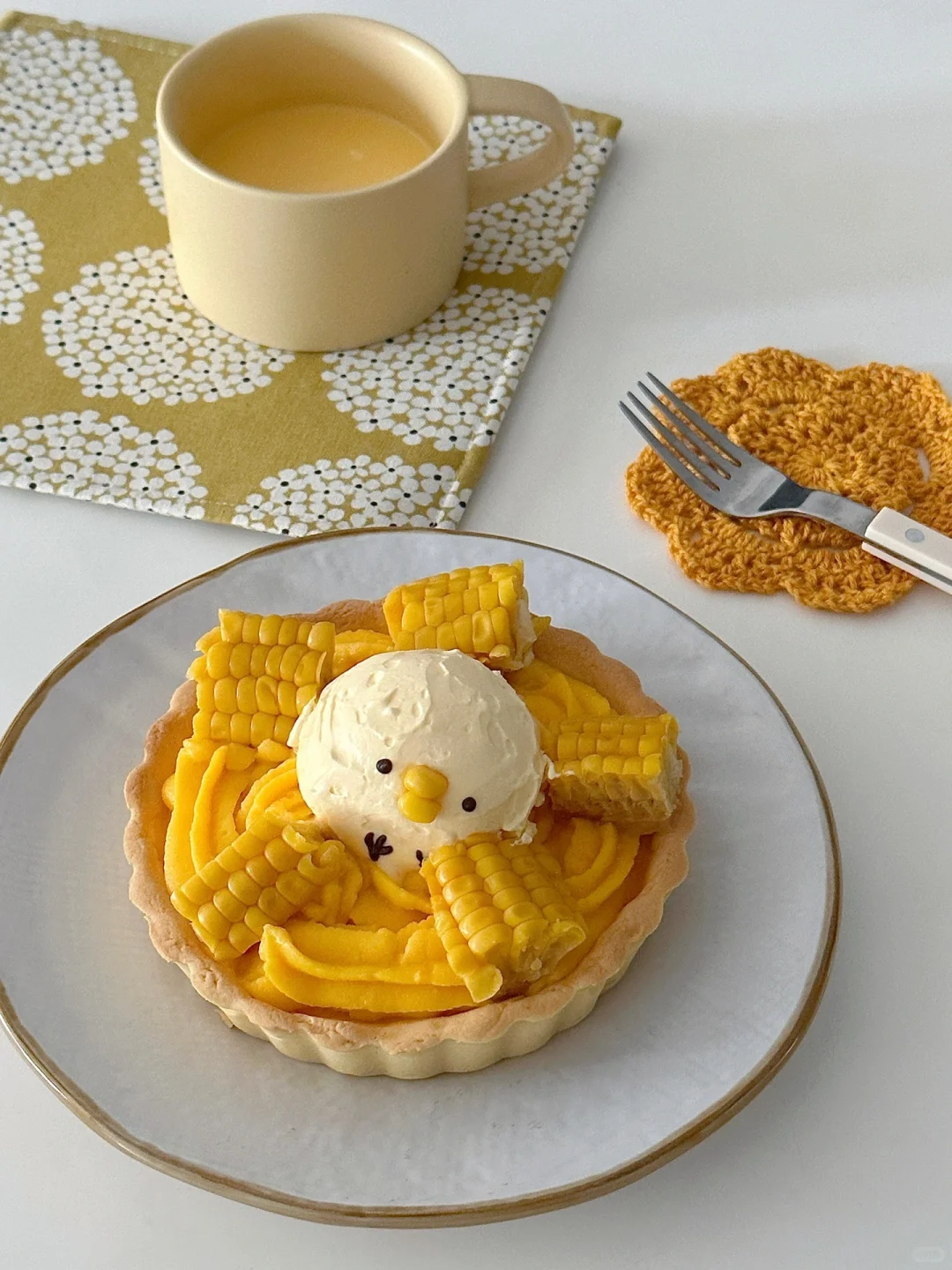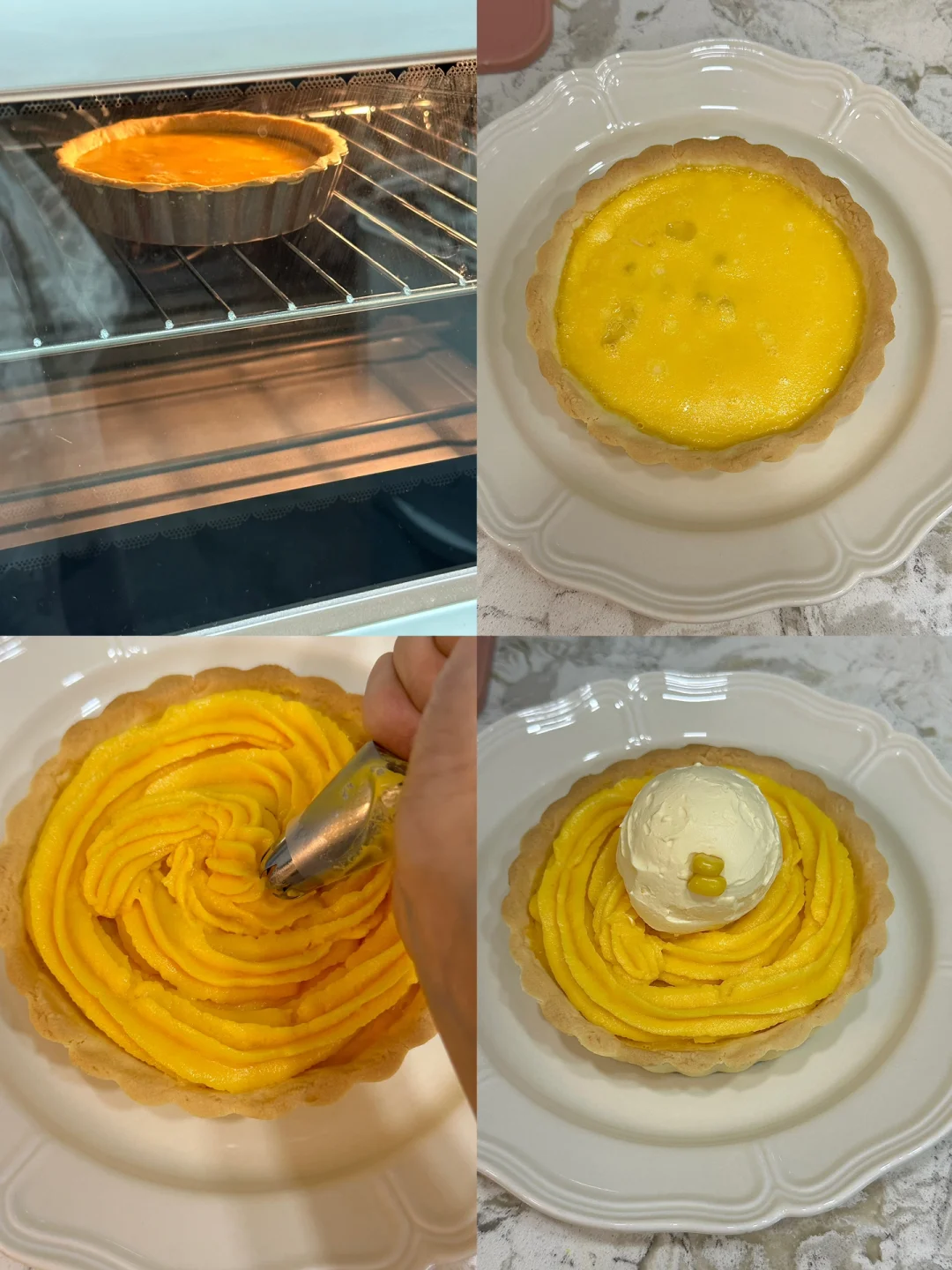 ⑥烤好的挞取出稍微晾凉再脱模(不容易碎),玉米卡仕达酱装入裱花袋挤在挞上