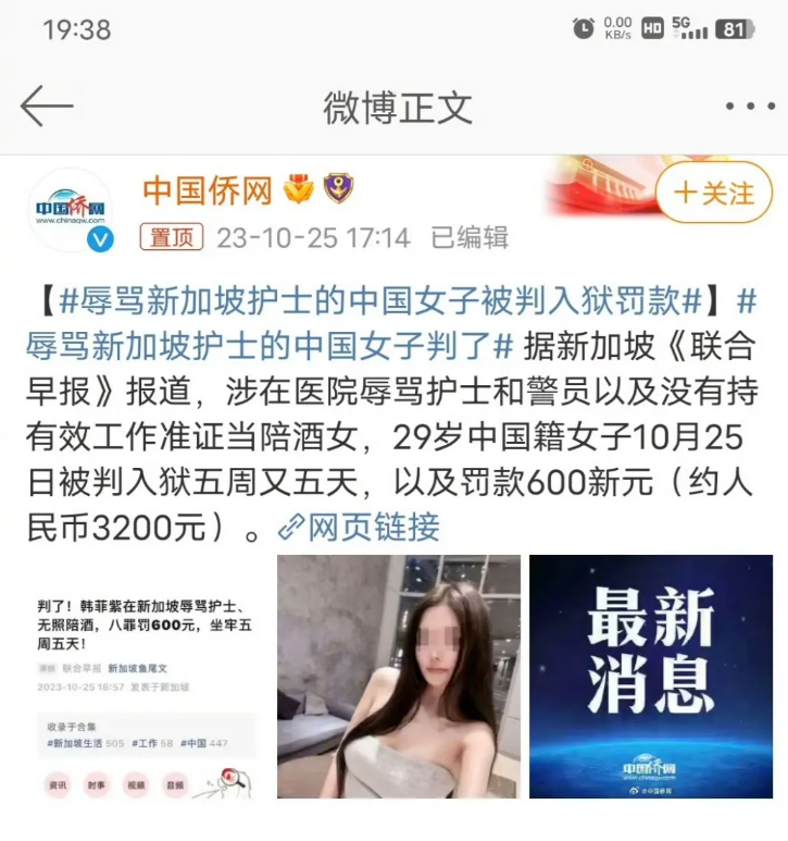 辱骂新加坡护士的中国女子判了,希望这事能够给更多的国人警示!本来这个女的被撞是个值得同情的事情,但因为她的任性的胡搅蛮缠,因为她的小作文式举报,把在国内很多人常用的那一套搬到了国外,结果就是让自己从有理变成了没理,而且罚款、蹲大狱、名声受损!