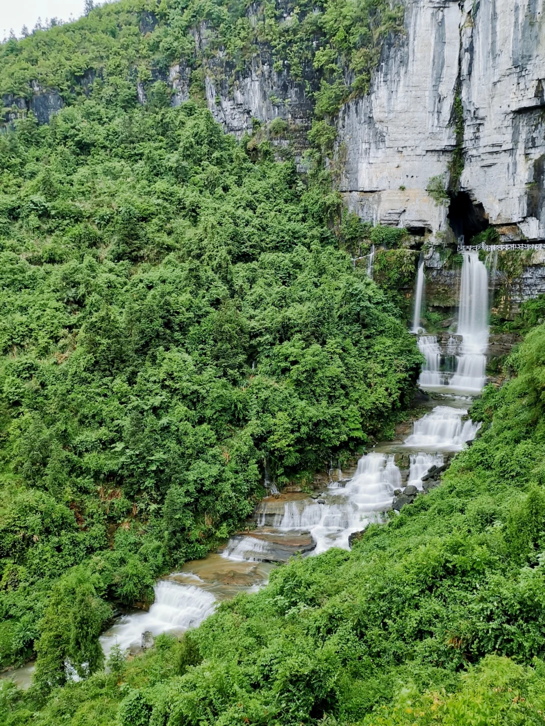 位于贵定县沿山镇石板村的腊利寨,山上有一溶洞流水灌溉着周边的农田,溪流穿寨而过形成三级瀑布,经摆卜河流入摆龙河。