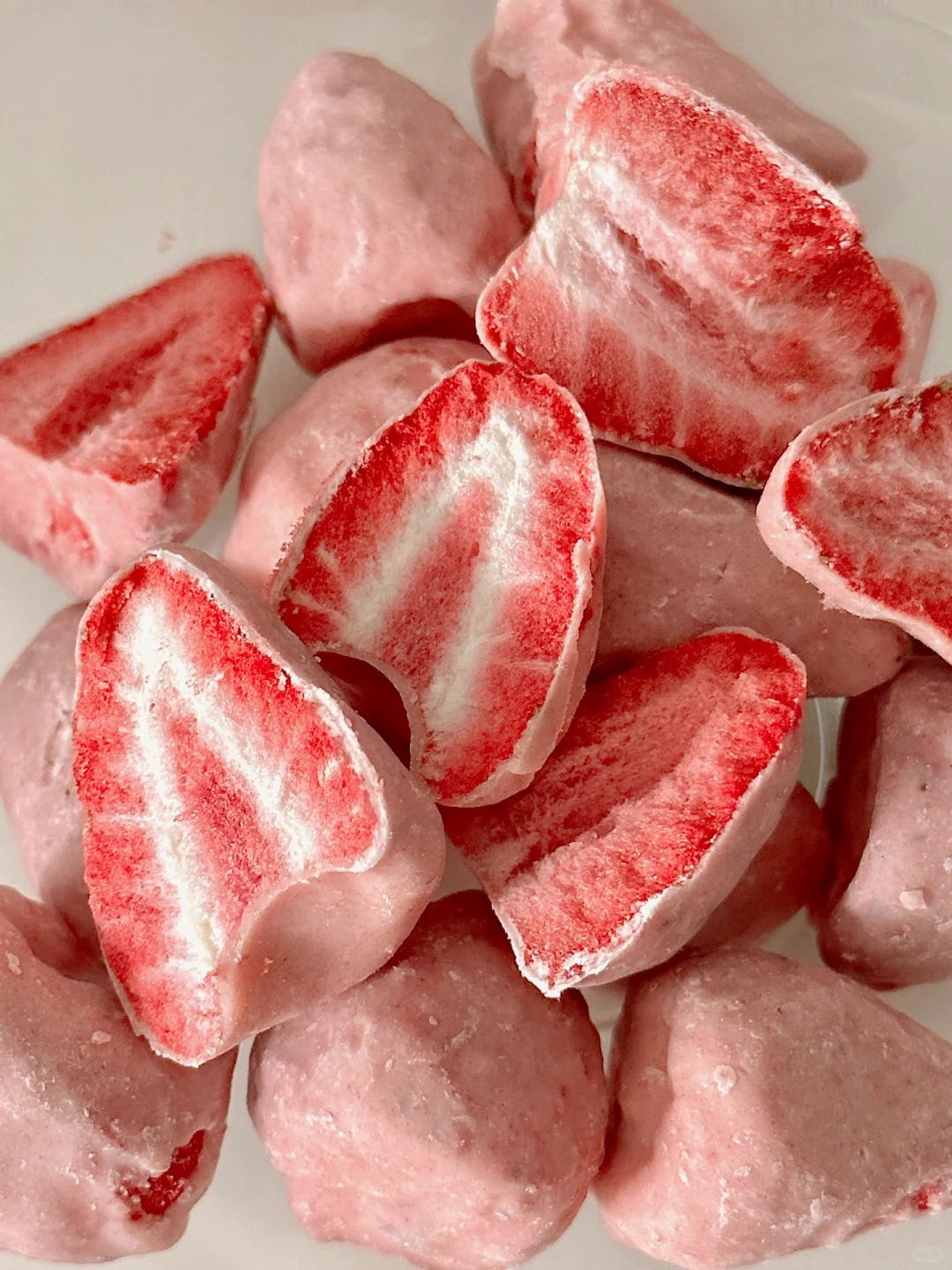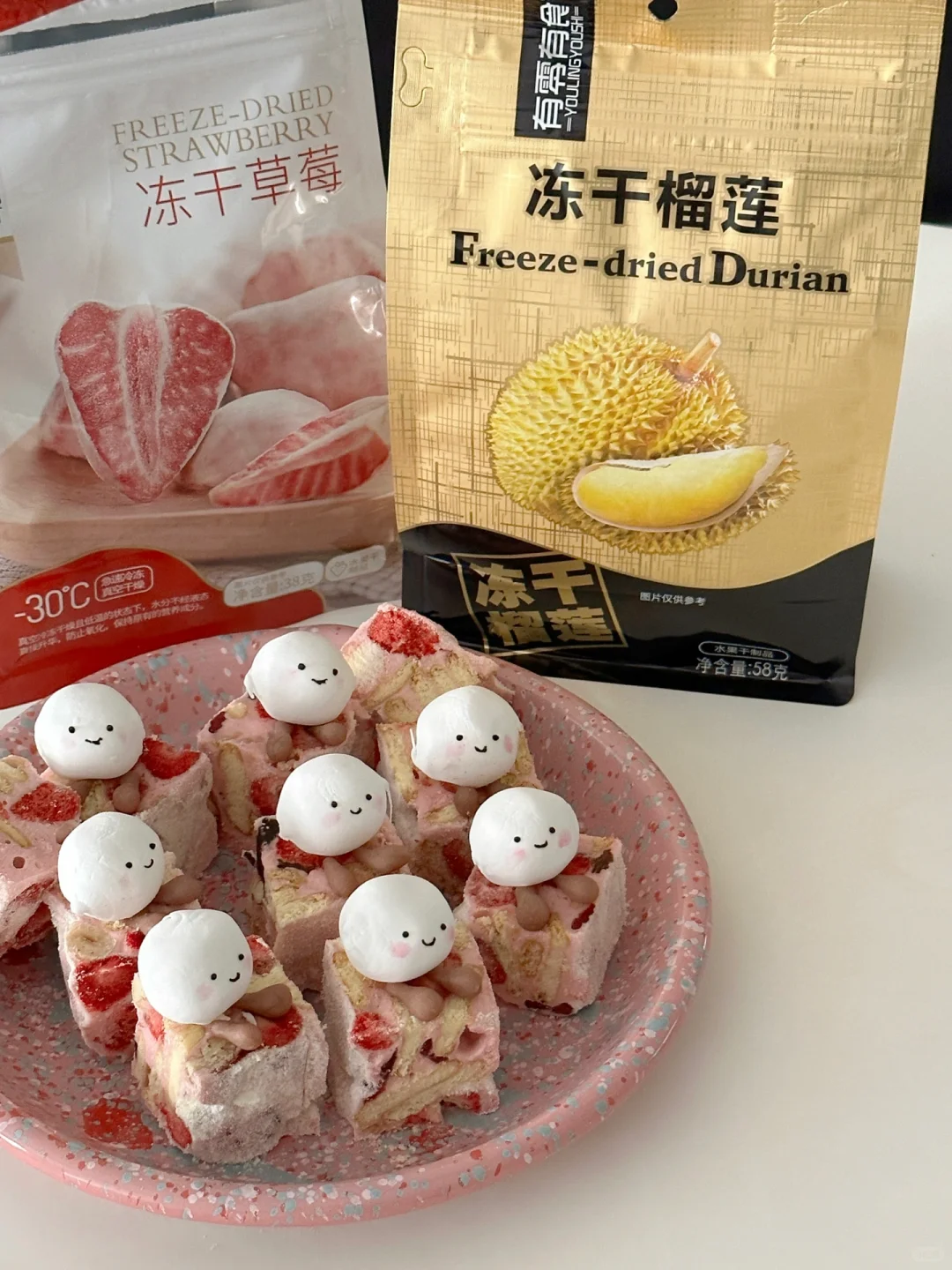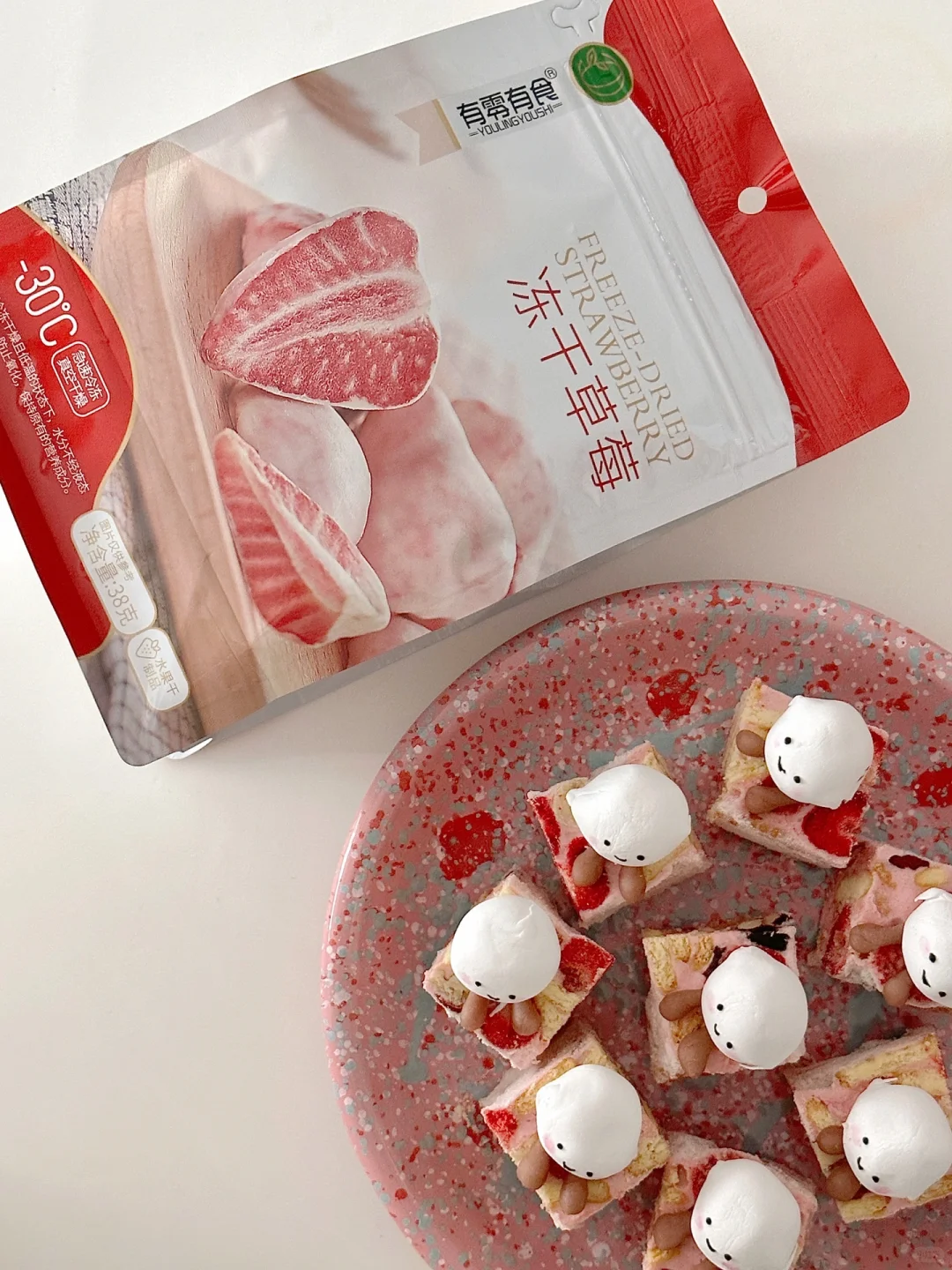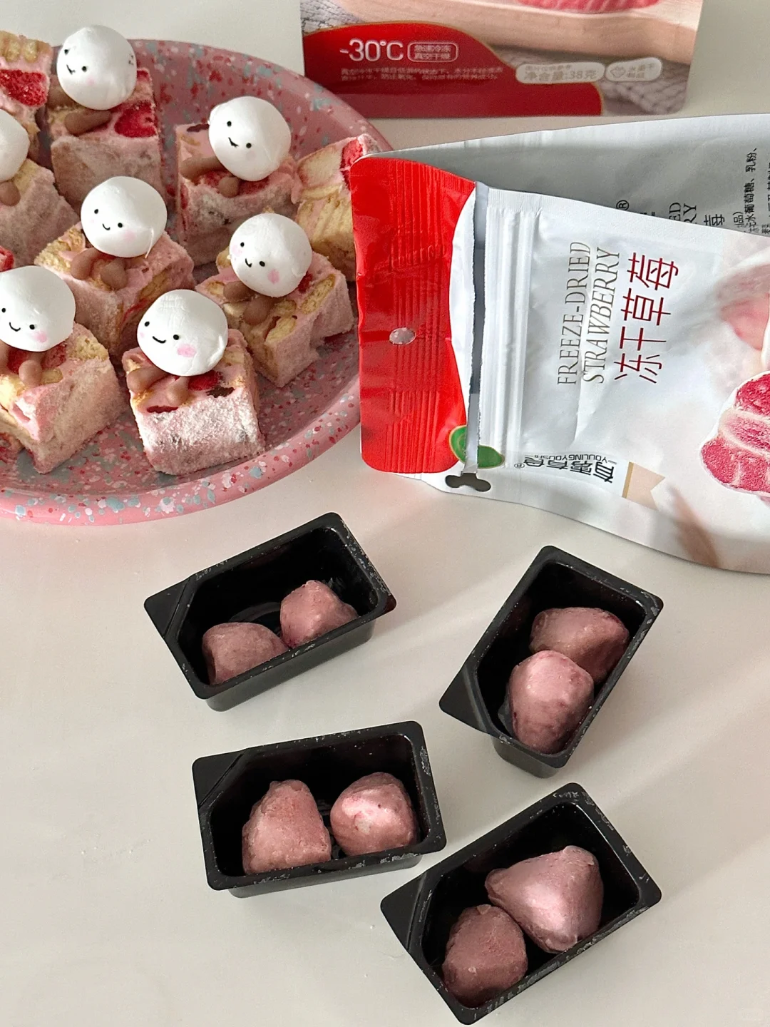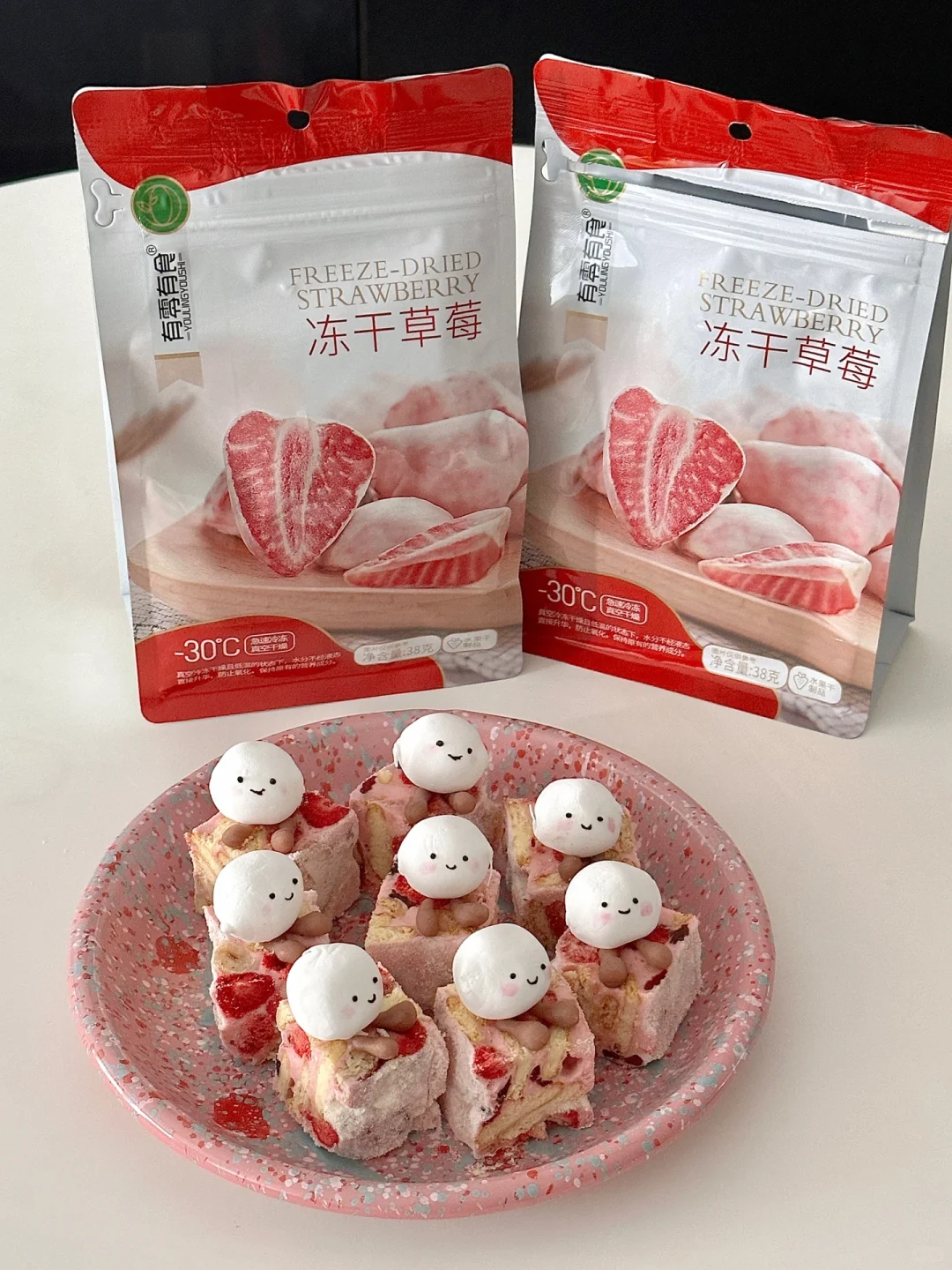 近日种草了有零有食家的冻干草莓,将自然熟的丹东红颜草莓零下30°C低温低压真空脱水,保留了草莓的香甜营养,外皮一层薄薄的乳粉,酸甜酥脆,维C含量多多,很适合制作雪花酥!还有他们的冻干榴莲也很喜欢,榴莲味超醇正!