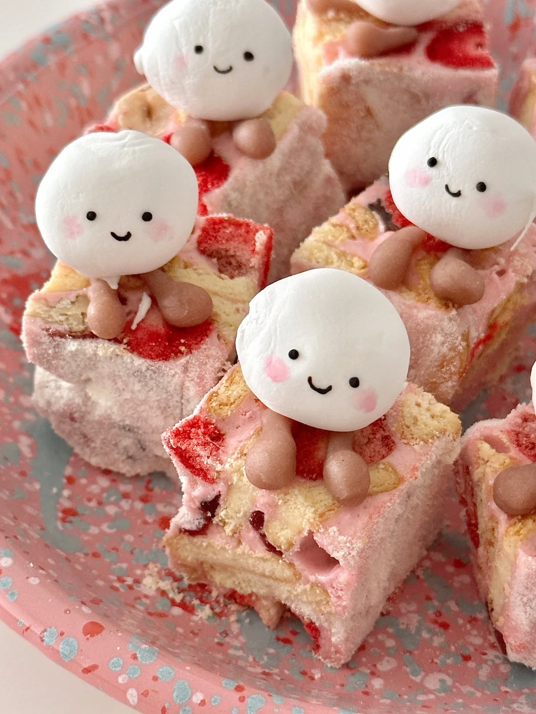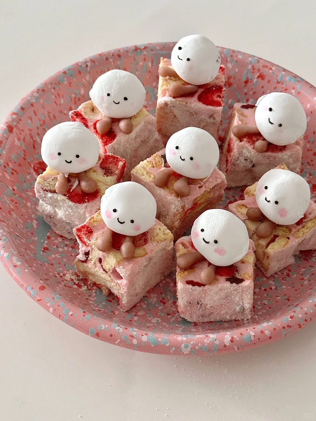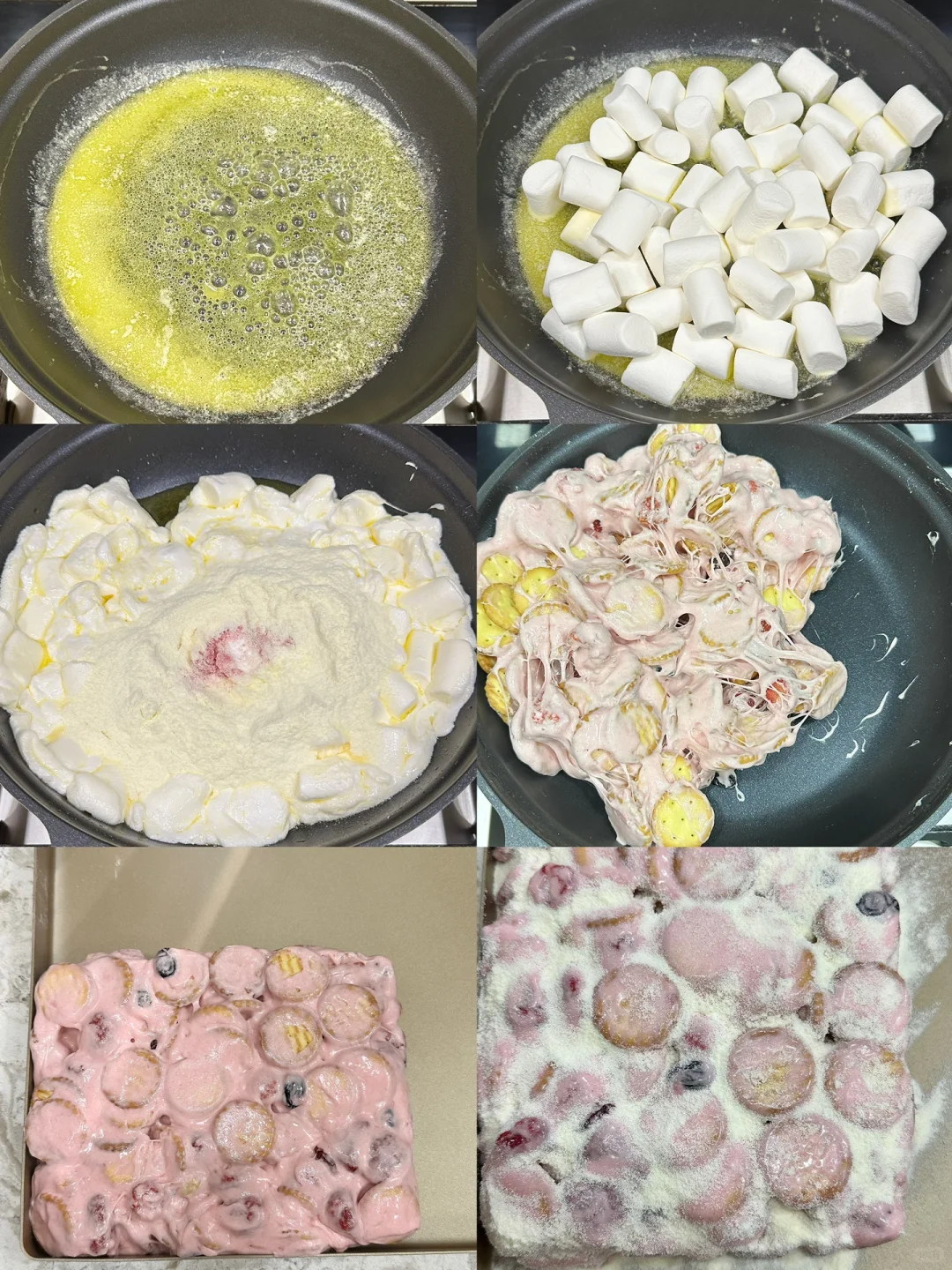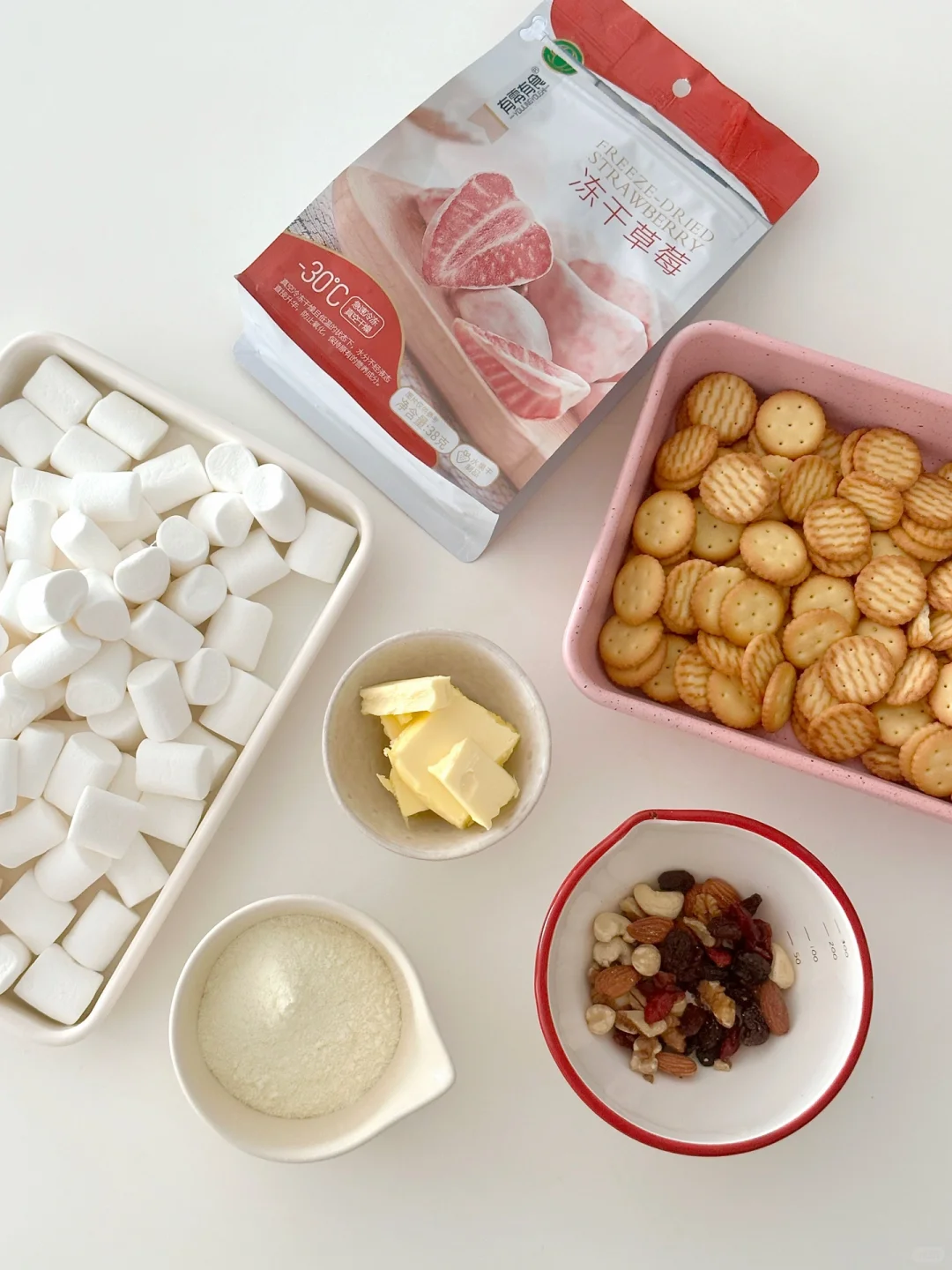 棉花糖200g,小饼干180g,冻干草莓50g,奶粉45g,混合坚果45g,黄油55g,仙人掌果粉适量