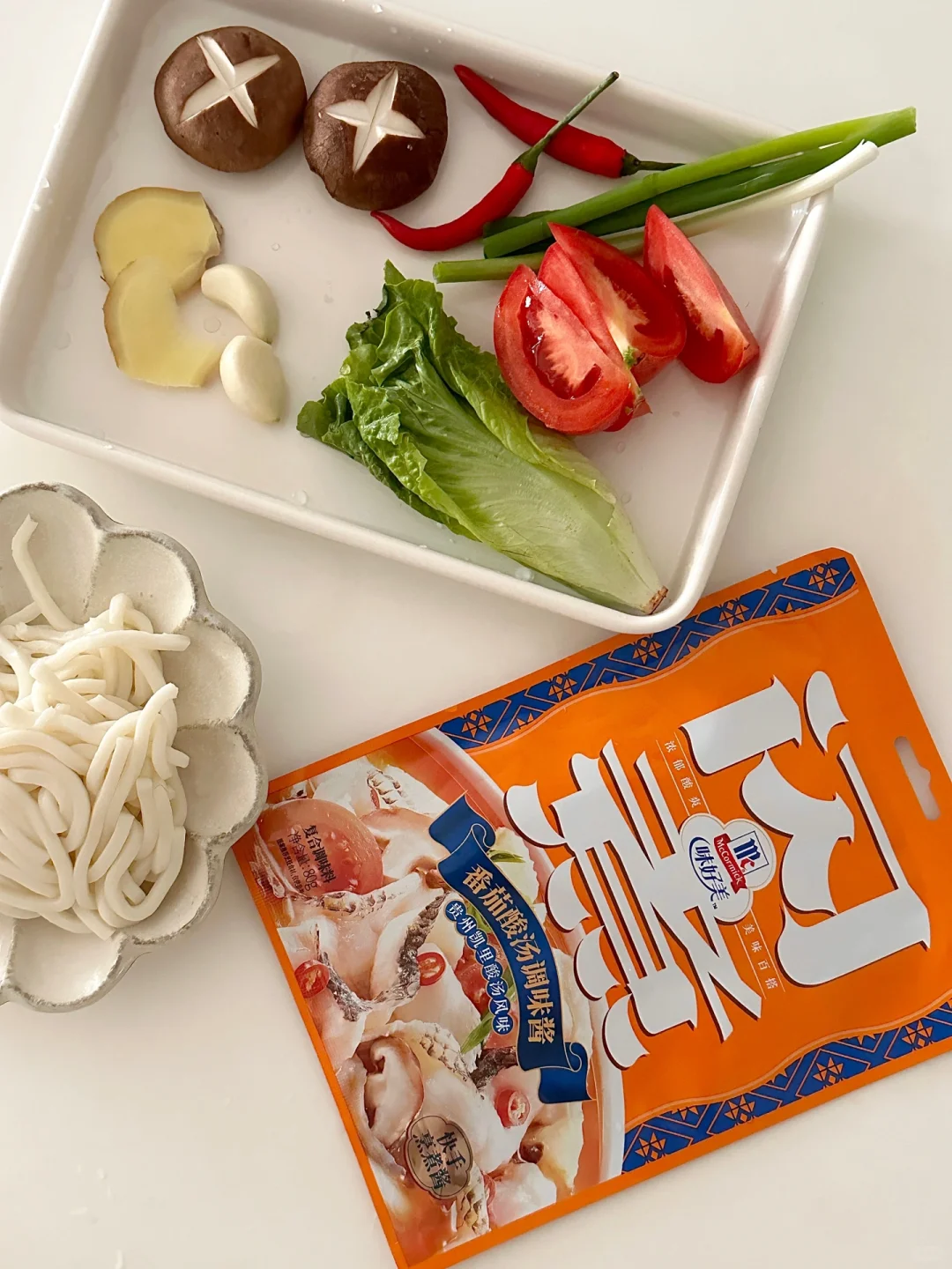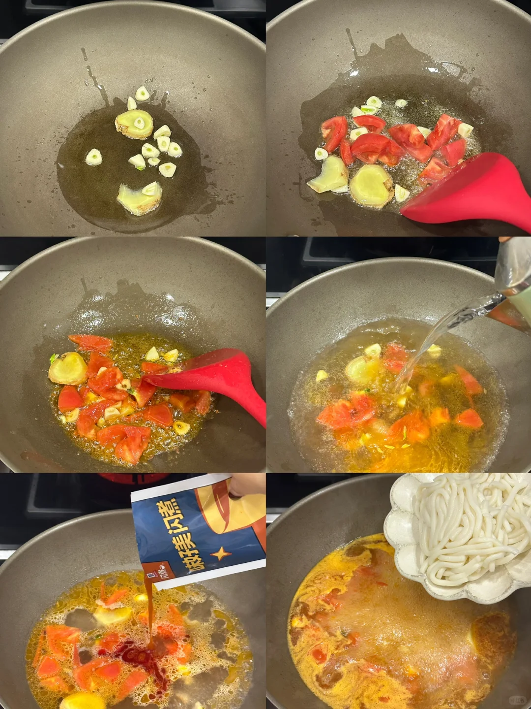 ⑥准备姜蒜热油爆香,加入番茄丁炒出红油,加入热水,倒入味好美闪住番茄酸汤调味酱,最后下入乌冬面煮2-3分钟即可