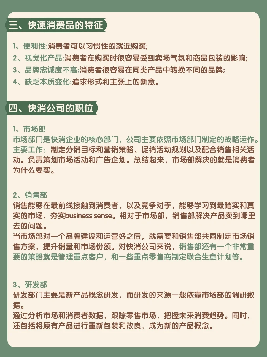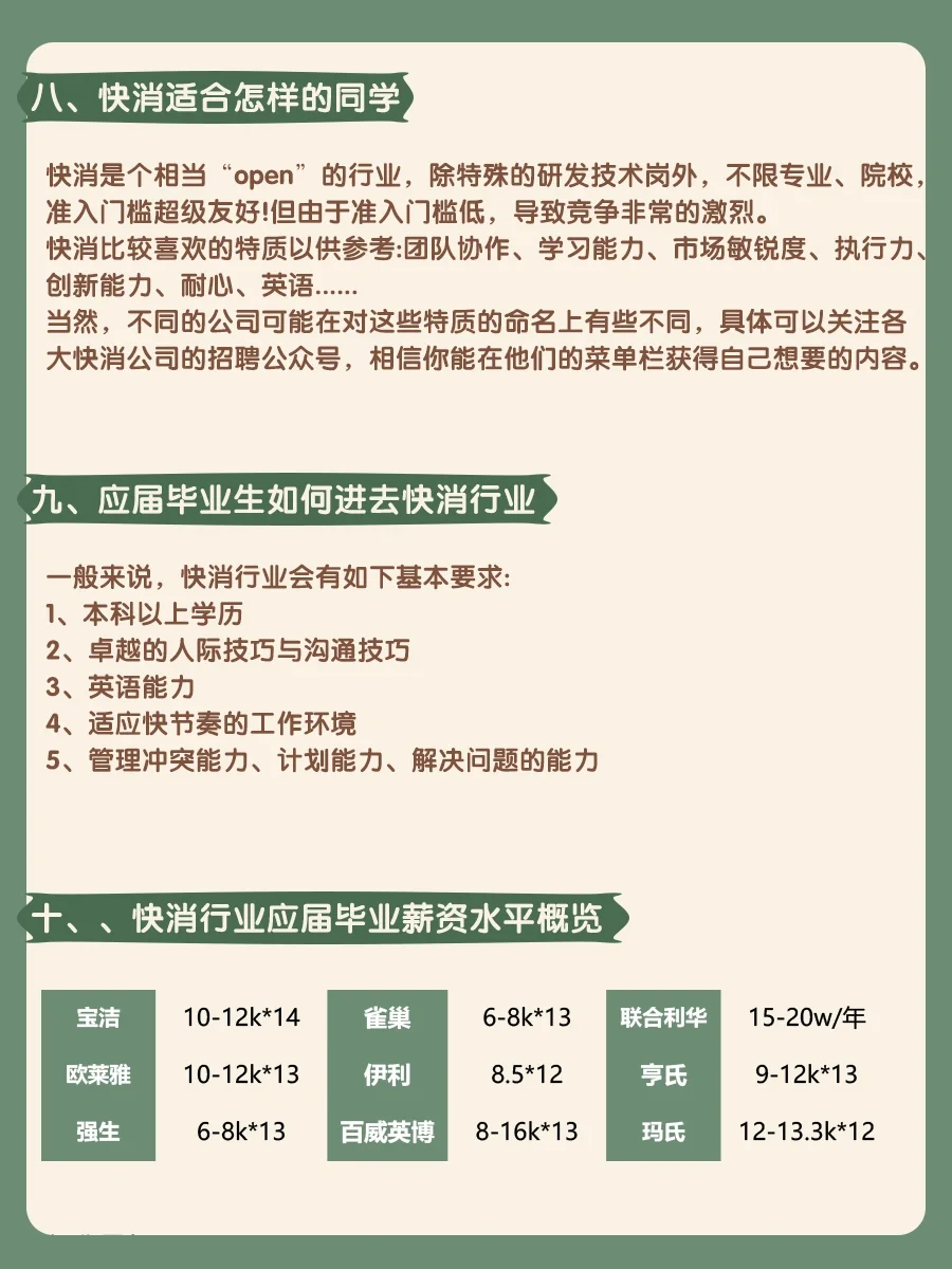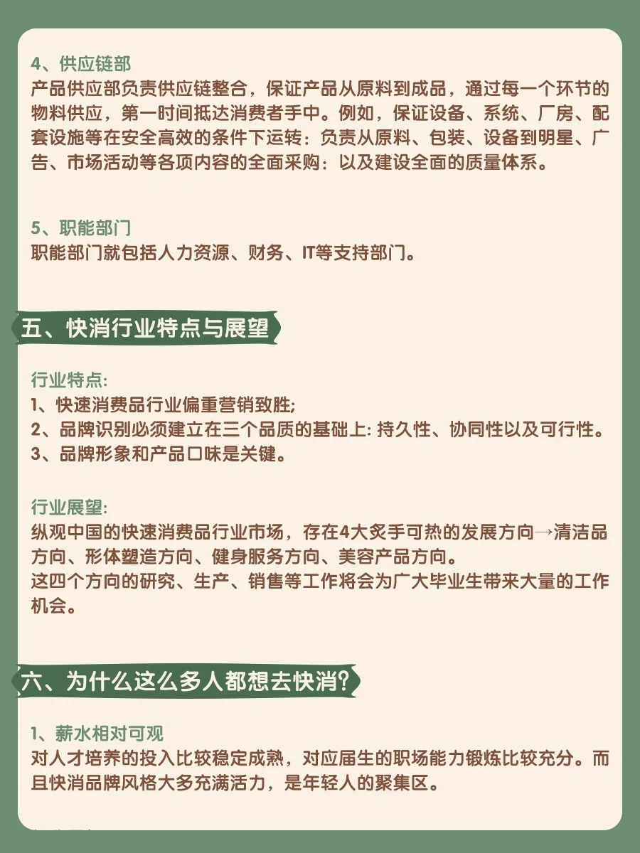 ✅一文带你搞懂快消行业 👉想要从事快消行业的小伙伴们一定要看‼ 👉今天给小伙伴们从这几点写出 1⃣什么是快消 2⃣快速消费品的分类 3⃣快速消费品的特征 4⃣快消公司的职位 5⃣快消行业特点与展望 6⃣为什么这么多人都想去快消 7⃣快消行业对人才的需求 8⃣快消适合怎样的同学 9⃣应届毕业生如何进去快消行业 🔟快消行业应届毕业薪资水平概览 📢这些内容希望可以帮助到小伙伴们,赶紧收藏起来吧‼‼