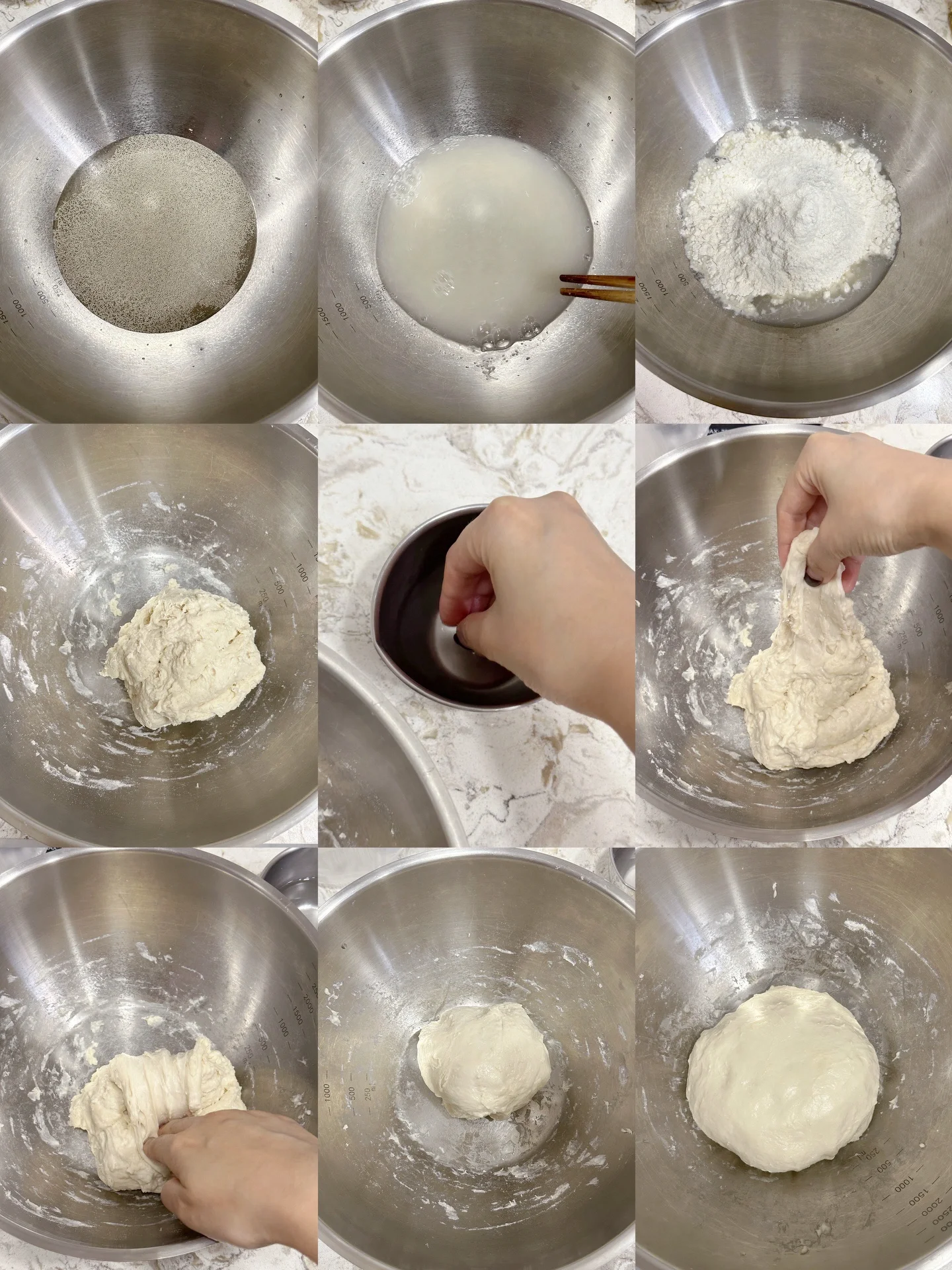 ④手沾水从底部托起面团,全部裹上面粉防粘,放在油纸上用双手手指按压,配合拉伸整形