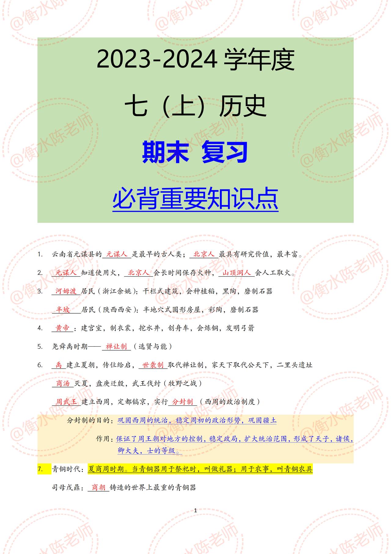 七年级上学期历史,期末复习,各单元必背重要知识点总结,期中考试,历史没考好的,这套期末必考重要知识点,一定要认真背一遍,背完成绩不下95哦。