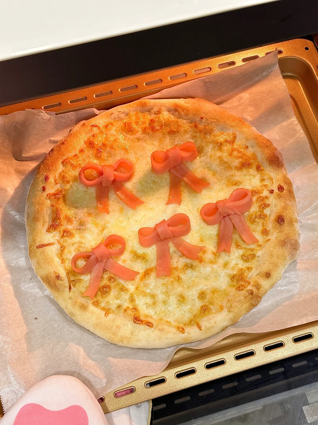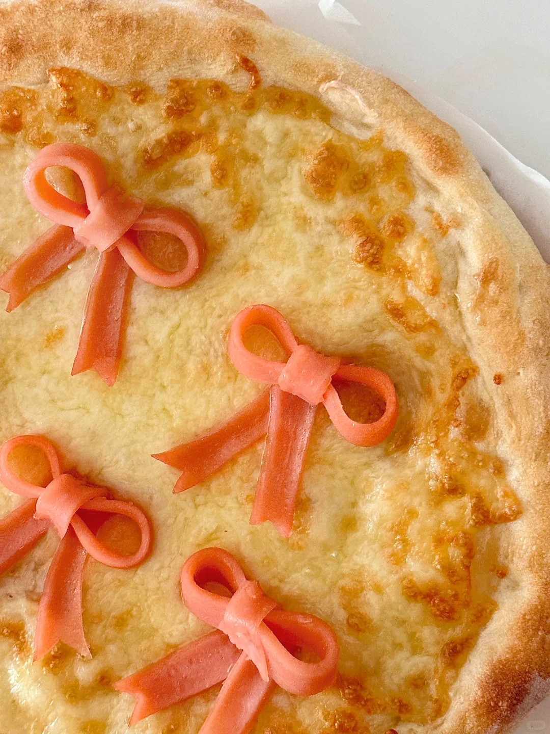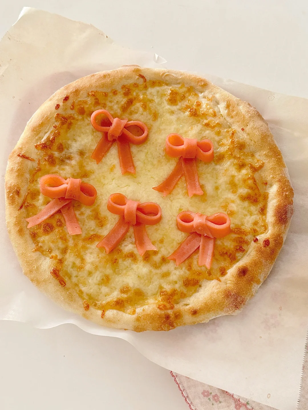 ⑥午餐肉切薄片,按照图示做出蝴蝶结,用细细的龙须面固定,摆在披萨上即可!
