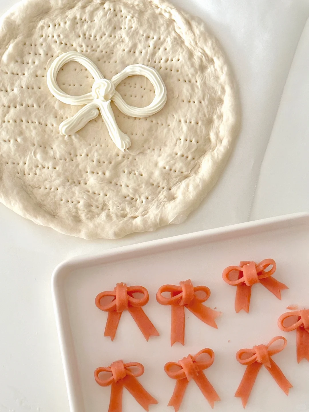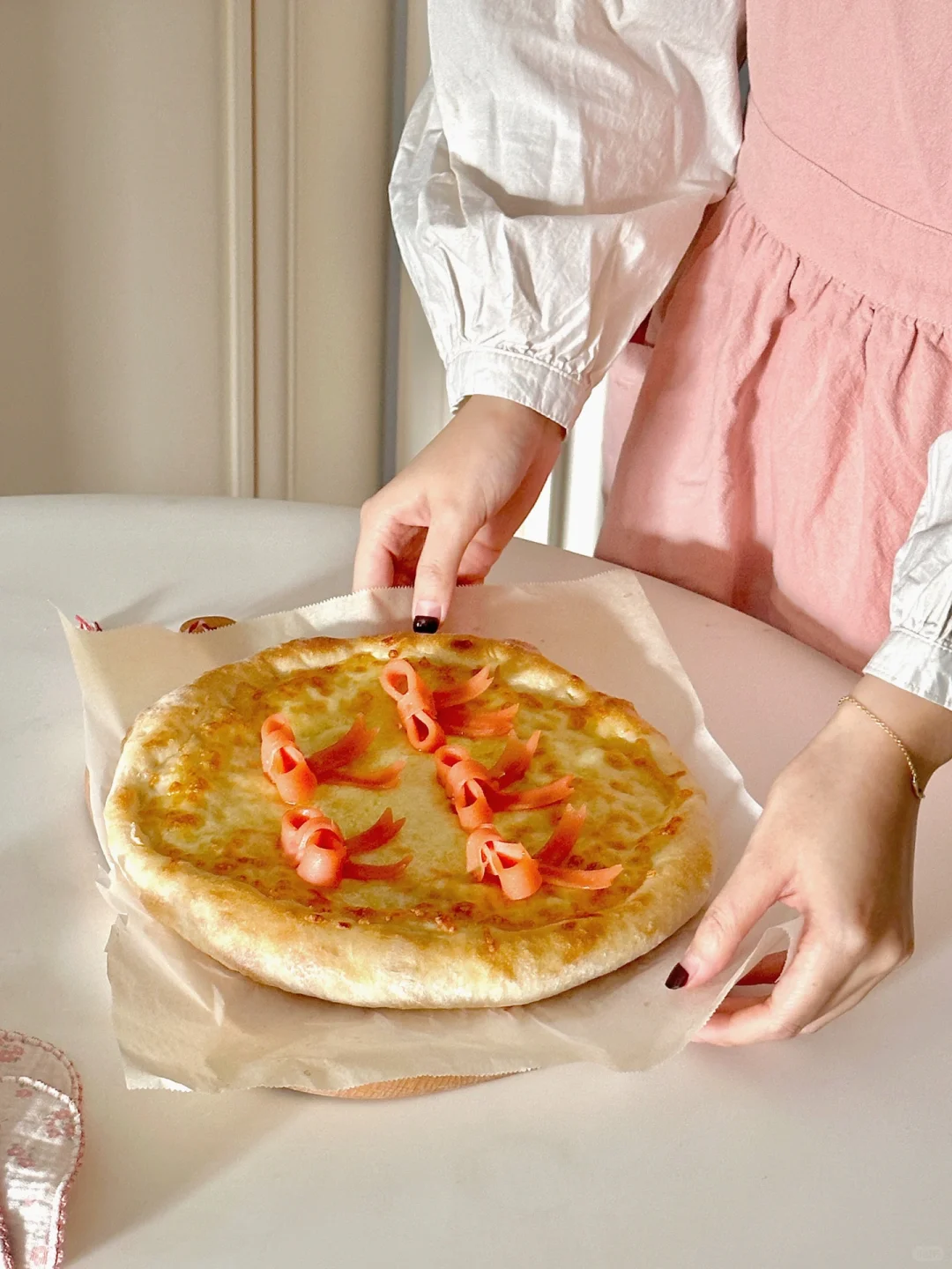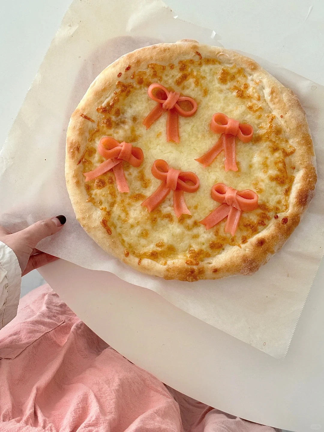 ⑥午餐肉切薄片,按照图示做出蝴蝶结,用细细的龙须面固定,摆在披萨上即可!