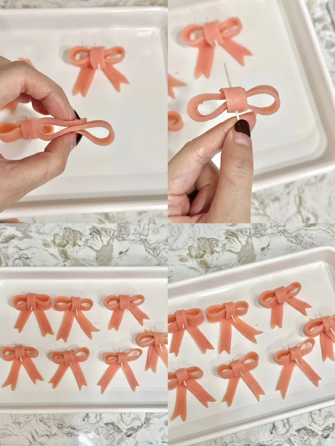 午餐肉切成薄薄的片,用细细的龙须面做固定,做成可爱的小🎀。