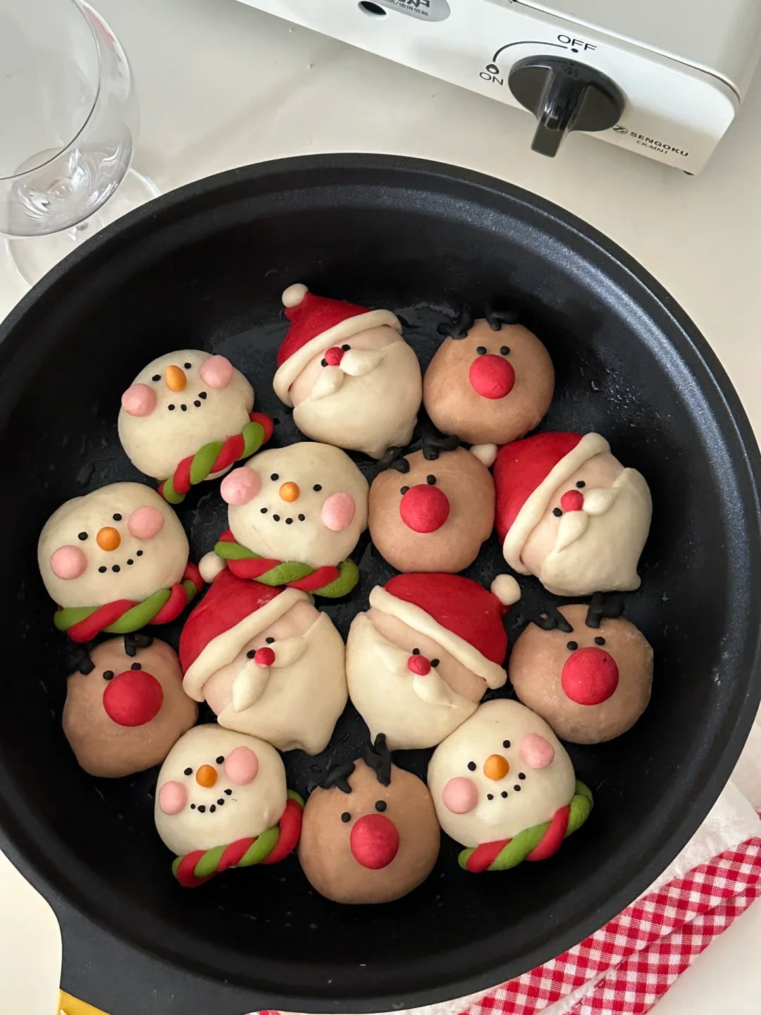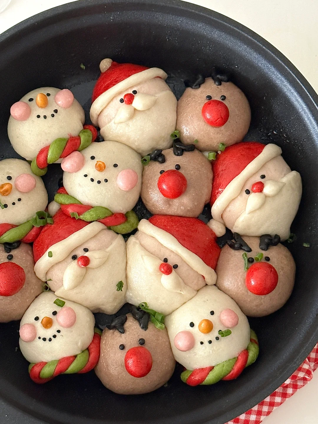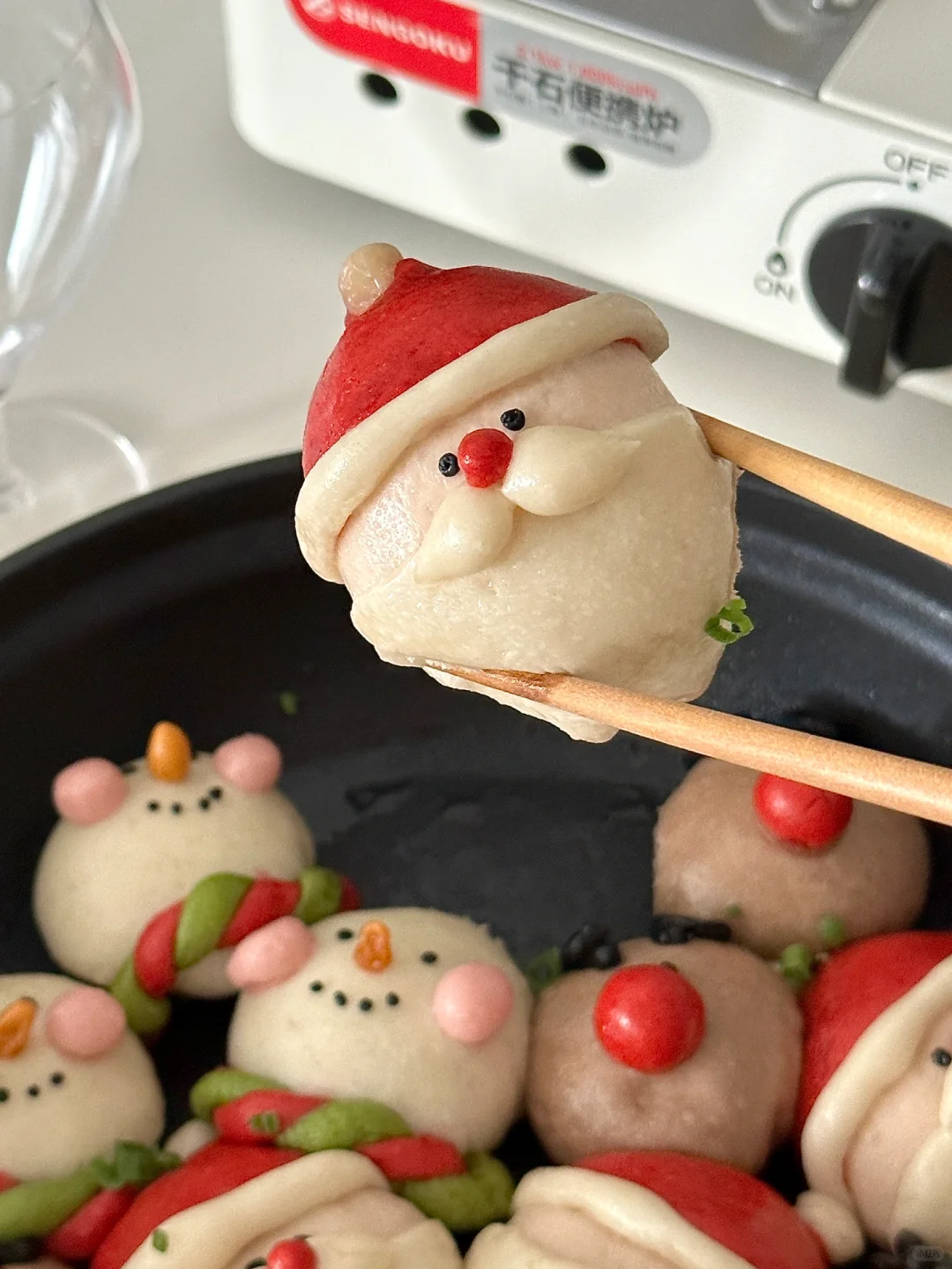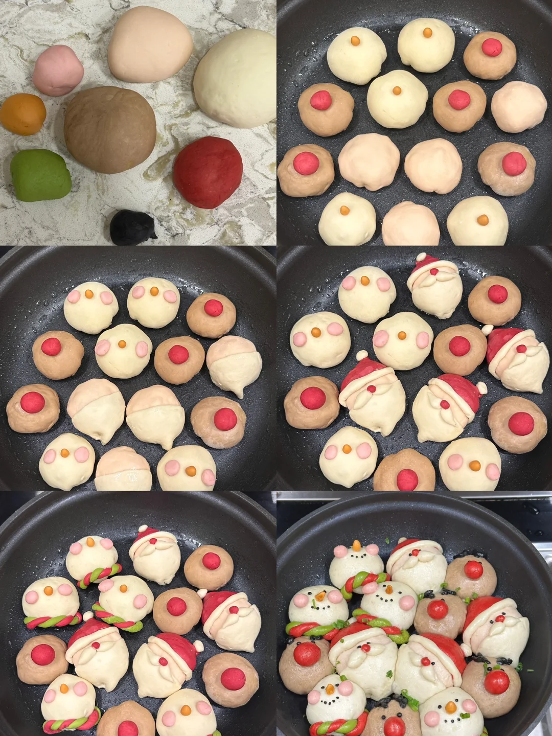⑥平底锅刷油摆放包好的包子,收口朝下,按照图示做出圣诞老人,麋鹿以及雪人细节部分