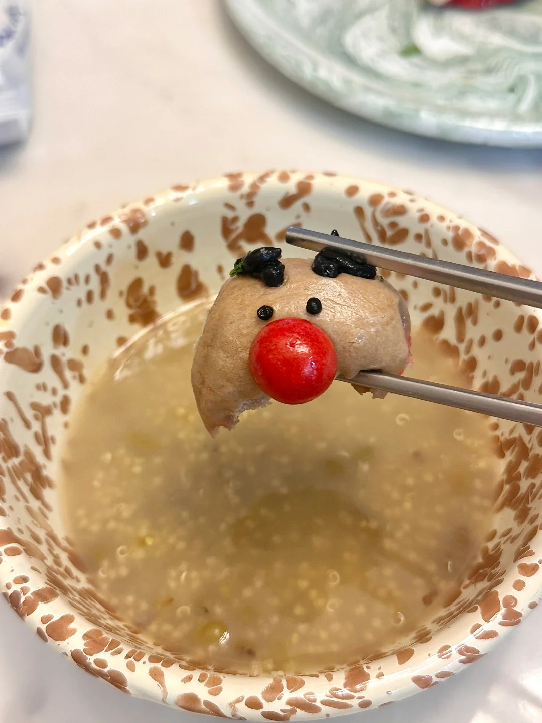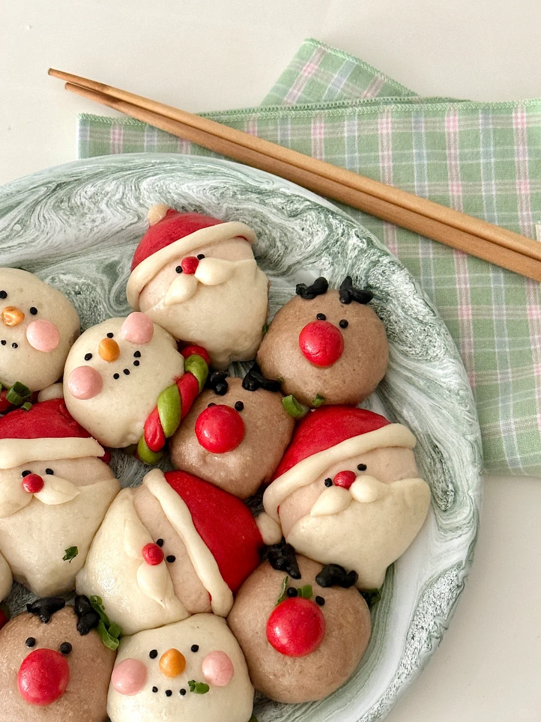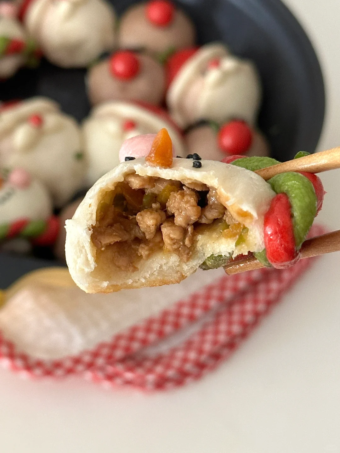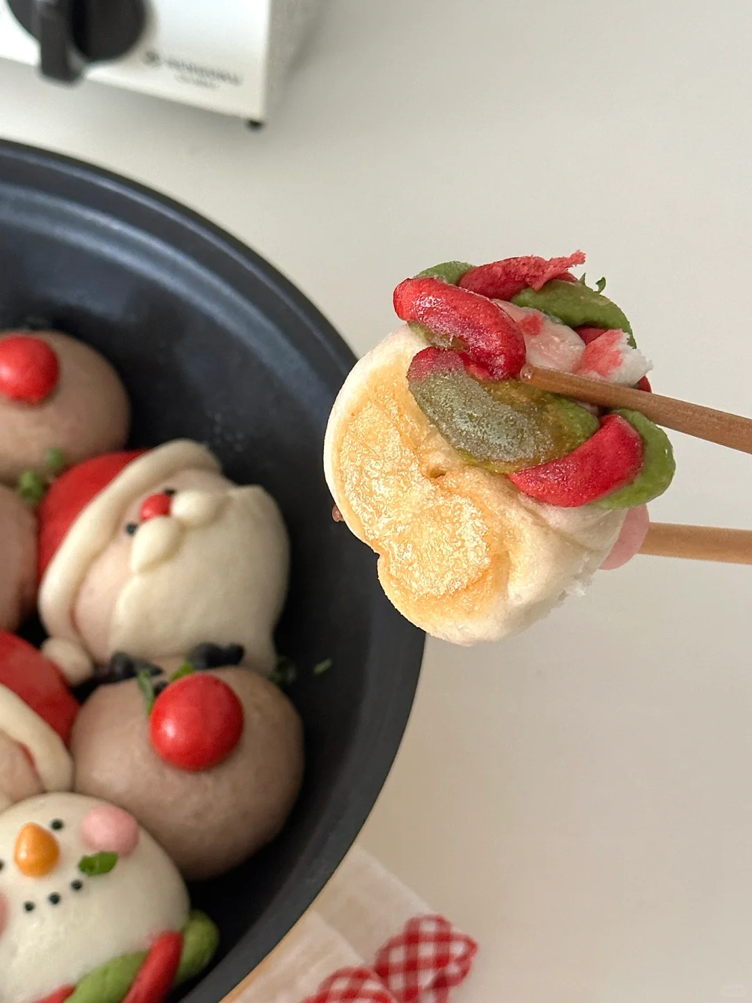 ⑥平底锅刷油摆放包好的包子,收口朝下,按照图示做出圣诞老人,麋鹿以及雪人细节部分