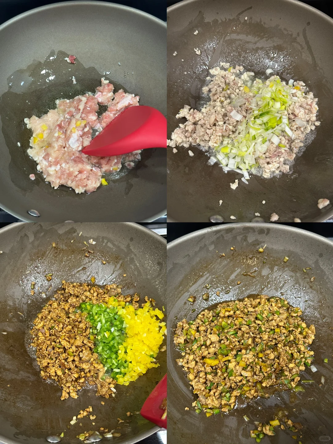 ②热油下入鸡肉粒翻炒变色,加入大葱碎,以及剩余调味料翻炒,最后加入青椒翻炒一分钟即可出锅
