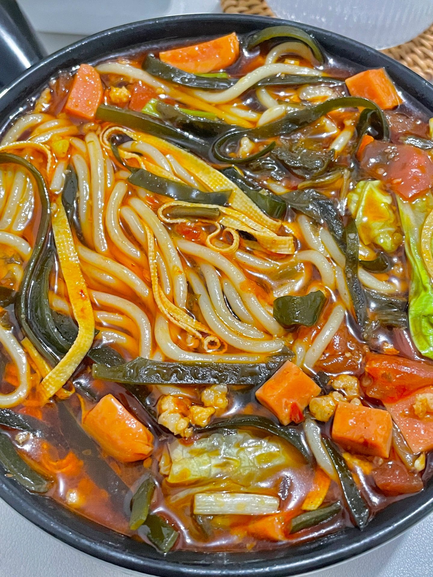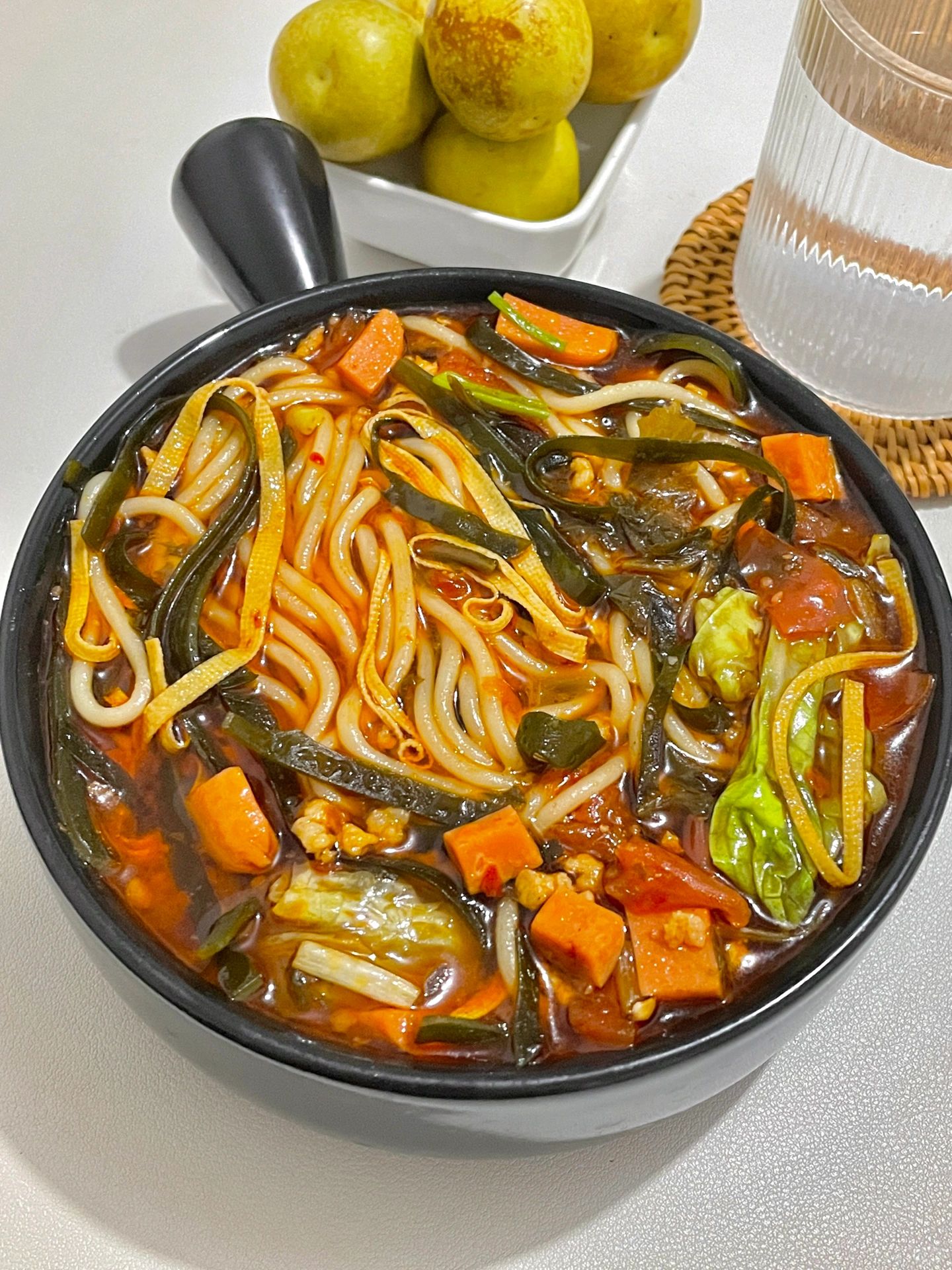 1⃣️一块火锅底料,酸菜、番茄丁、小米辣炒香。适量清水,二勺生抽、一勺蚝油、少许盐和鸡精。