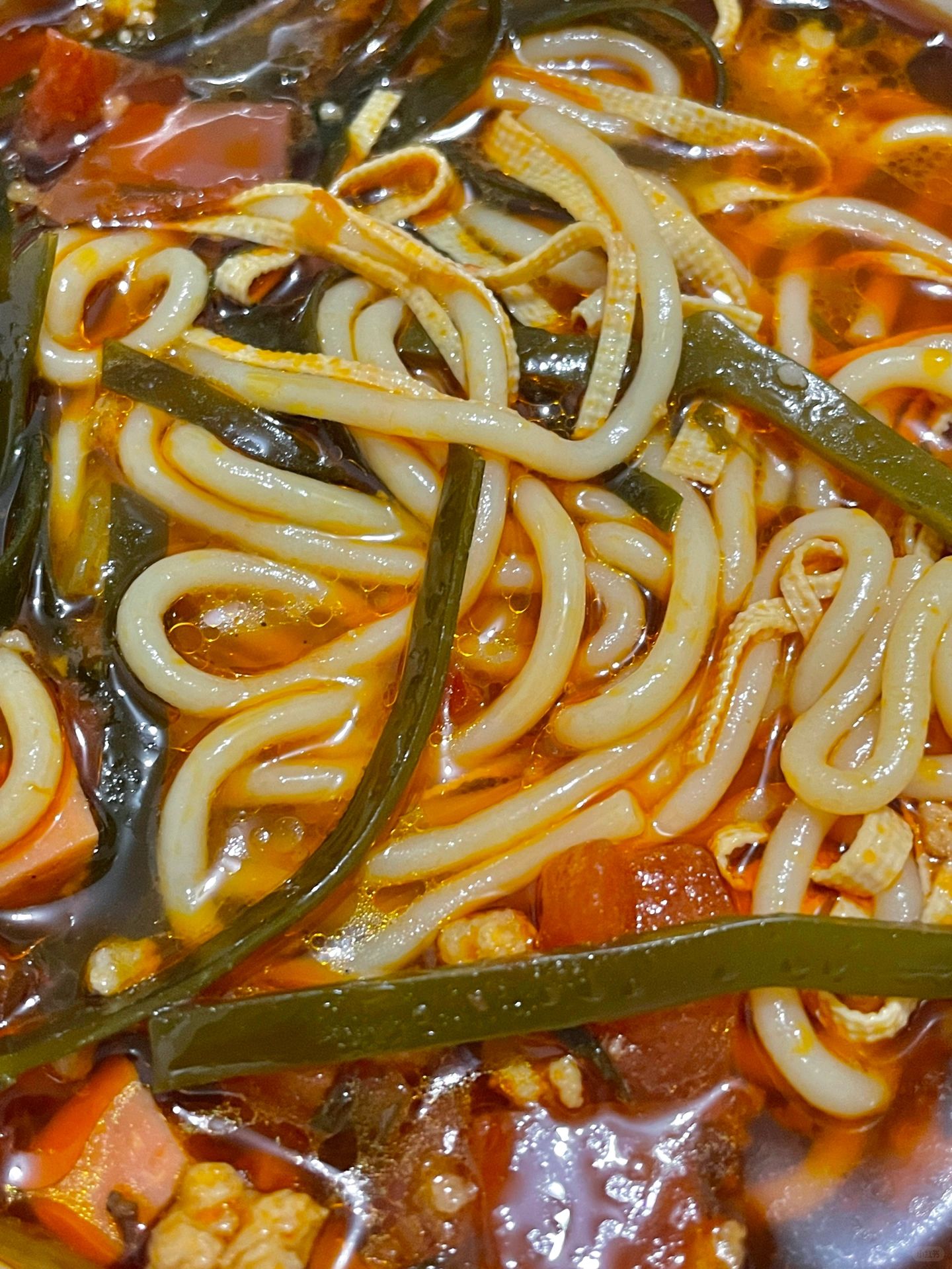 2⃣️水开放肉末、火腿丁煮一会。再放千张丝、海带丝。煮一会,放泡好的米线。