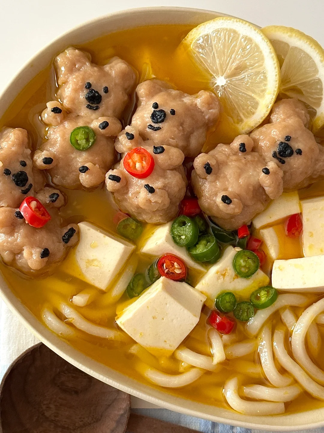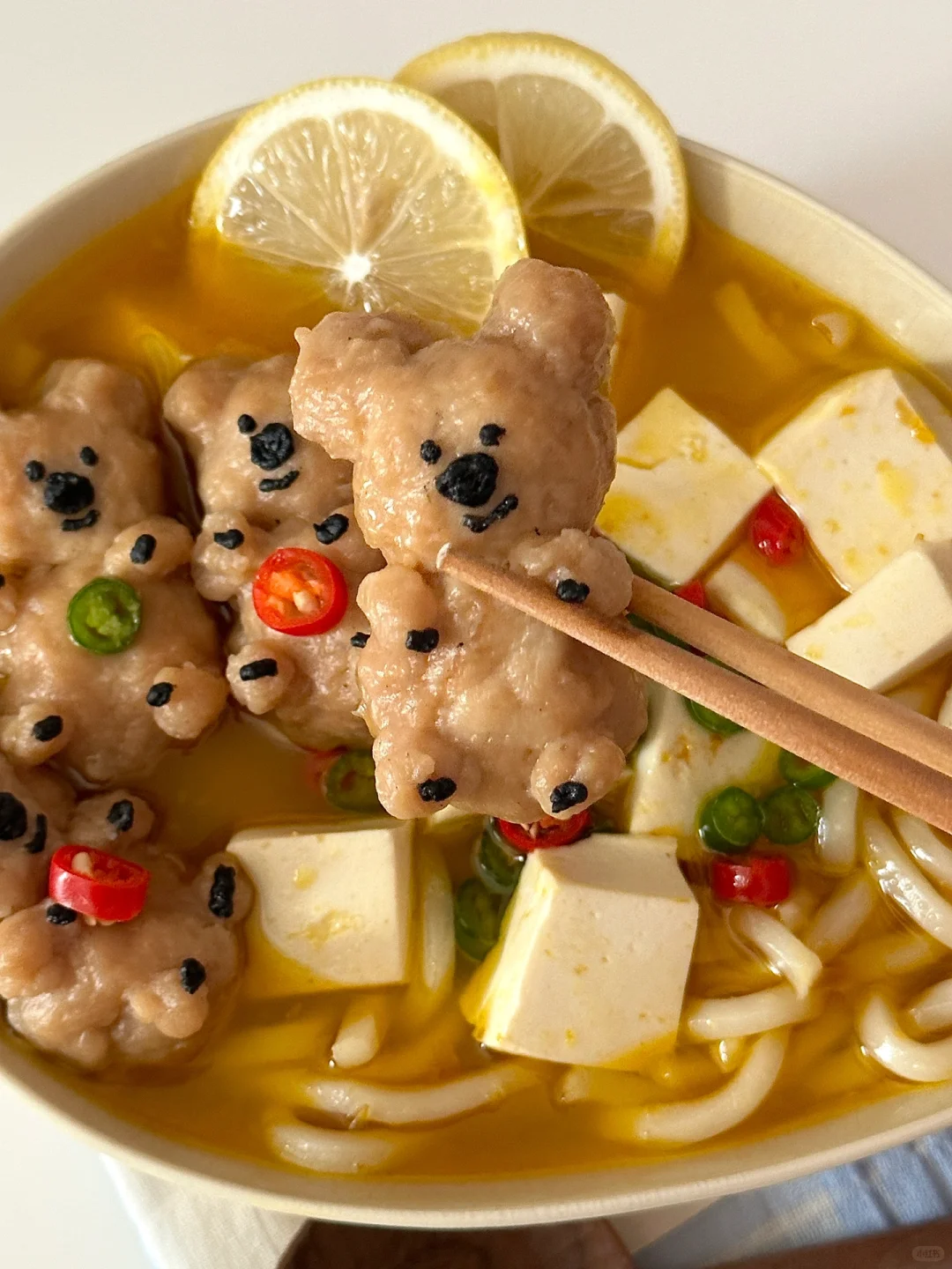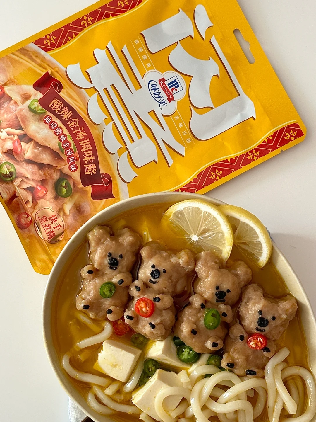 喝口酸辣鲜香的金汤,就着爽滑的乌冬面和可可爱爱鱼丸,这一餐真的hǐn幸福[萌萌哒R][两颗心R][两颗心R] 柿子椒熊鱼丸所需食材: 巴沙鱼180g,葱姜水13g,少量盐,白胡椒粉,玉米淀粉10g,老抽,竹炭粉 制作步骤: ①巴沙鱼加入葱姜水,盐,白胡椒粉,少量老抽(上色需要)搅打成细腻的泥状 ②加入玉米淀粉搅拌均匀 ③取小小部分加入竹炭粉调成黑色备用 ④按照图示捏出柿子椒熊的样子,捏的过程手上沾些水更好塑型不粘手。剩余四肢用裱花袋挤出来 ⑤黑色鱼泥部分当如裱花袋剪小小小口,挤出鼻子眼睛和小手小脚 ⑥中小火,水微微沸下入鱼丸,等飘浮起来就可以捞出备用 ⑦准备姜蒜热油爆香,加入味好美闪煮酸辣金汤调味酱,酸辣鲜香色泽金黄,发酵黄剁椒搭配香蒜,辣椒,真的十分下饭! ⑧加入热水,最后下入乌冬面和豆腐块煮2-3分钟即可 ⑨点缀想吃的蔬菜以及柿子椒熊鱼丸 快来交作业吧![偷笑R]