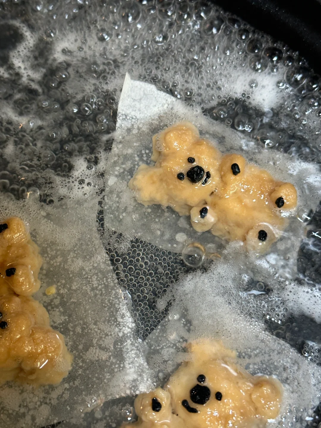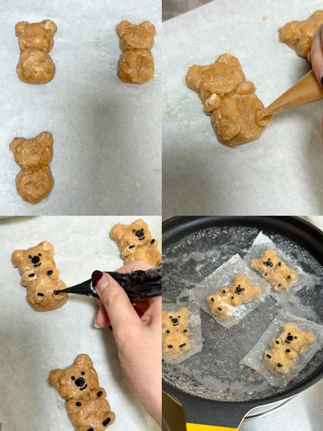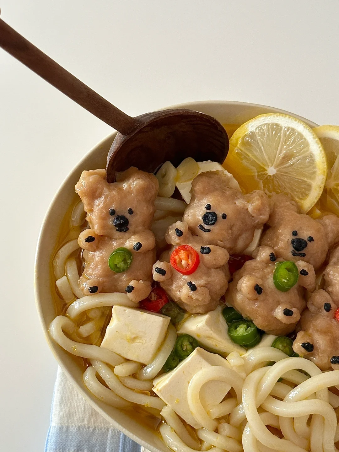 喝口酸辣鲜香的金汤,就着爽滑的乌冬面和可可爱爱鱼丸,这一餐真的hǐn幸福[萌萌哒R][两颗心R][两颗心R] 柿子椒熊鱼丸所需食材: 巴沙鱼180g,葱姜水13g,少量盐,白胡椒粉,玉米淀粉10g,老抽,竹炭粉 制作步骤: ①巴沙鱼加入葱姜水,盐,白胡椒粉,少量老抽(上色需要)搅打成细腻的泥状 ②加入玉米淀粉搅拌均匀 ③取小小部分加入竹炭粉调成黑色备用 ④按照图示捏出柿子椒熊的样子,捏的过程手上沾些水更好塑型不粘手。剩余四肢用裱花袋挤出来 ⑤黑色鱼泥部分当如裱花袋剪小小小口,挤出鼻子眼睛和小手小脚 ⑥中小火,水微微沸下入鱼丸,等飘浮起来就可以捞出备用 ⑦准备姜蒜热油爆香,加入味好美闪煮酸辣金汤调味酱,酸辣鲜香色泽金黄,发酵黄剁椒搭配香蒜,辣椒,真的十分下饭! ⑧加入热水,最后下入乌冬面和豆腐块煮2-3分钟即可 ⑨点缀想吃的蔬菜以及柿子椒熊鱼丸 快来交作业吧![偷笑R]