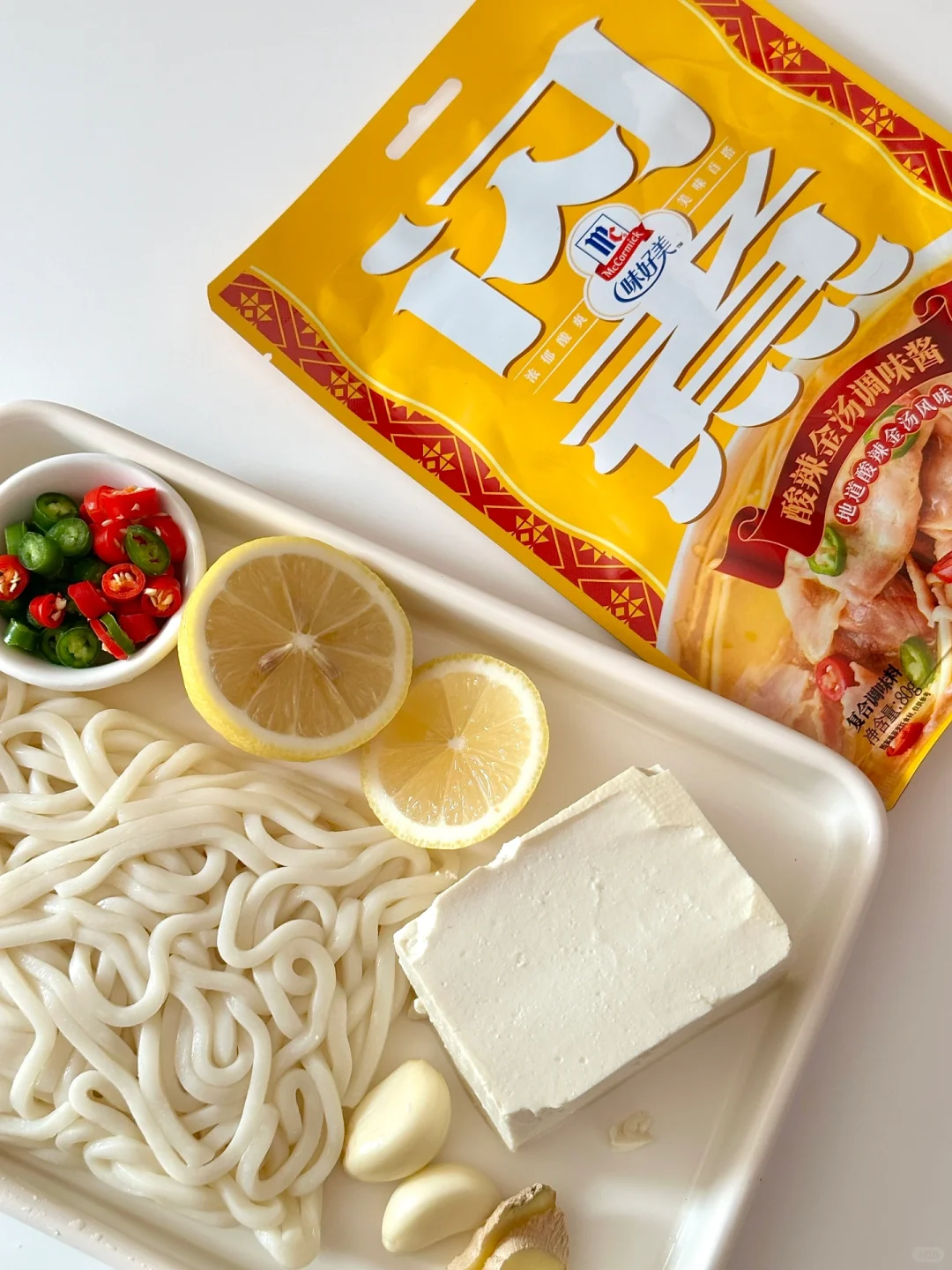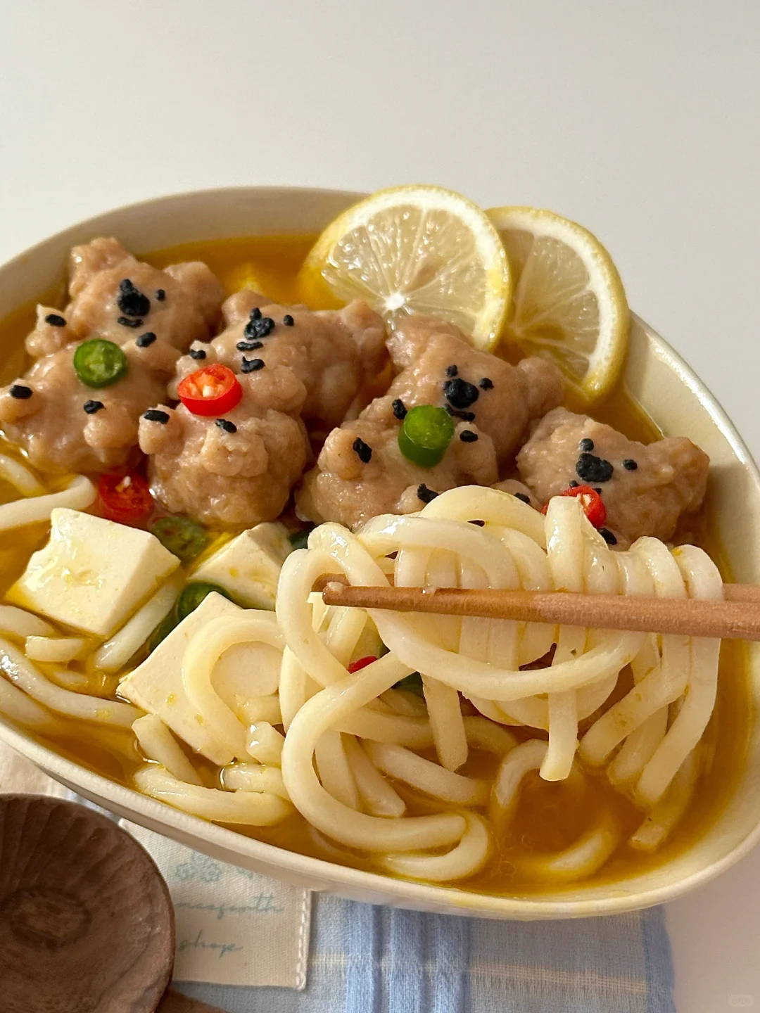 柿子椒熊鱼丸豆腐酸辣金汤乌冬面