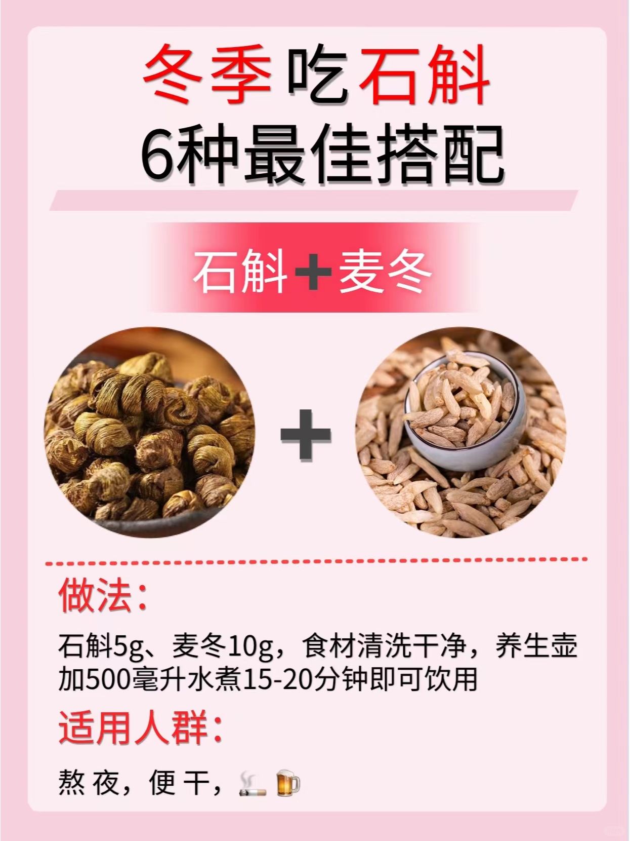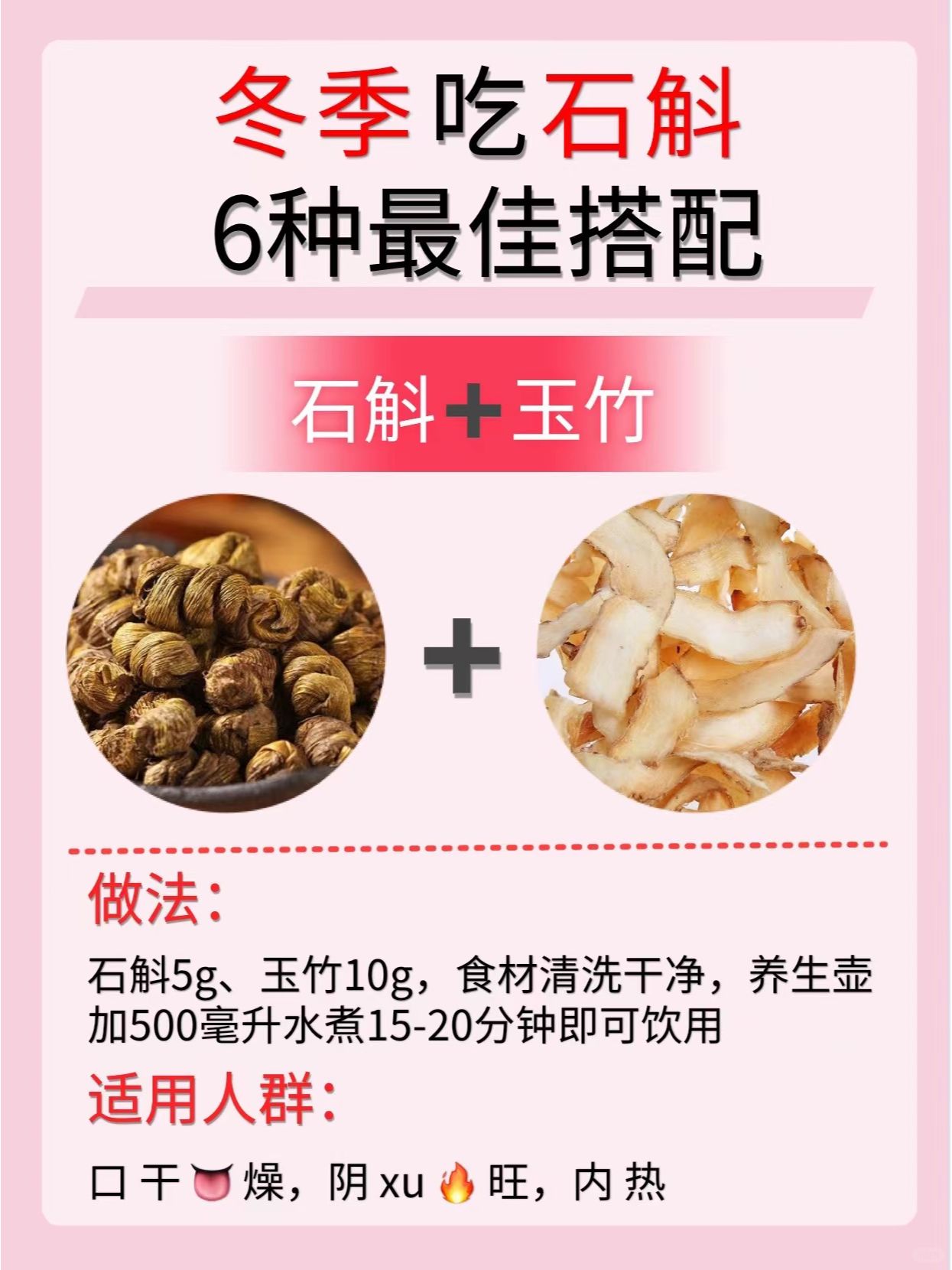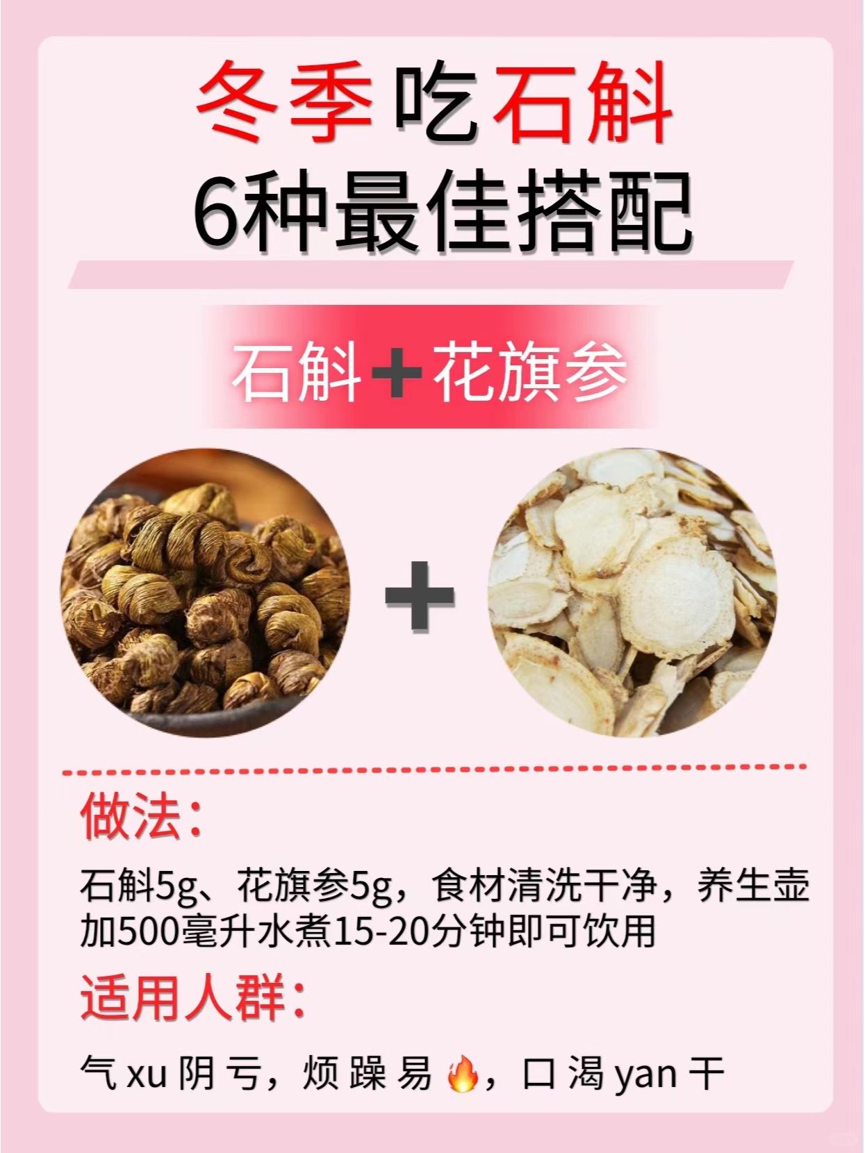 🔸中国古代有句话叫“北有人参,南有枫斗”。枫斗的母体是石斛,唐代开元时期的《道藏》将其列为“中华九仙草”之首。 🔸《神农本草》上经:石斛主伤中,除痹,下气,补五藏xu劳,瘦,强阴。 🔸✅冬天口干舌燥✅熬夜党必备✅抽🚬喝🍺 ✅石斛➕枸杞 ✅石斛➕麦冬 ✅石斛➕花旗参 ✅石斛➕沙参 ✅石斛➕黄芪 ✅石斛➕玉竹 🌸今天的分享就到这里了,希望大家喜欢🌸 持续关🐷我,每天分享更多养生小知识哦~