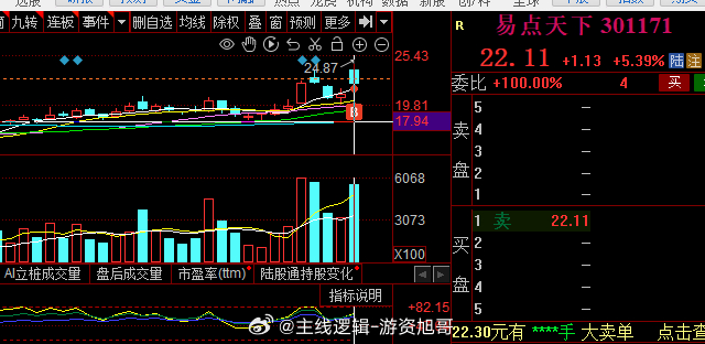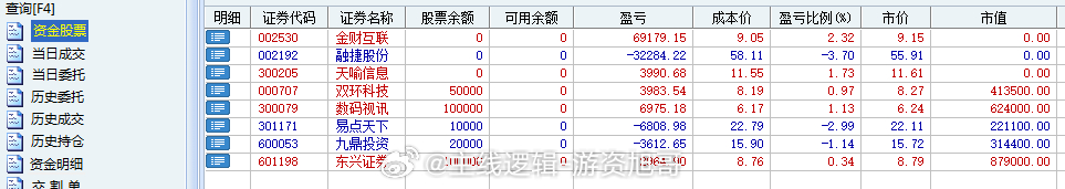 终于是收盘了,微赚的一天,今天一个涨停都没搞,昨天的金财 早盘冲高先处理了,昨日冲高回落,今日低开,大环境不好有机会红盘不贪,上午能够直接出手的不多,创业板虽然没赚钱但是挺强的,去了2笔,但是仓位不大,证券这块依旧是当下市场的核心去了一笔,大金融下午走好也去了,不过今天不行,互联网这块下午继续走强低位埋伏一些,明天赚点辛苦钱就行,有赚就行,要求不高,毕竟没有拿到最核心