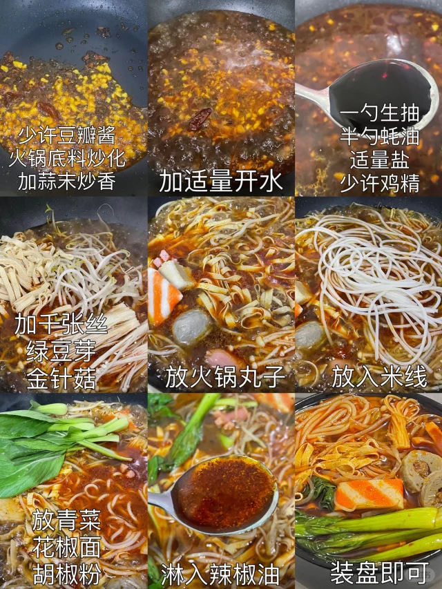 2-加适量开水,一勺生抽、半勺蚝油、适量盐、少许鸡精。加千张丝、绿豆芽、金针菇,煮一会。再放火锅丸子和泡放入米线。