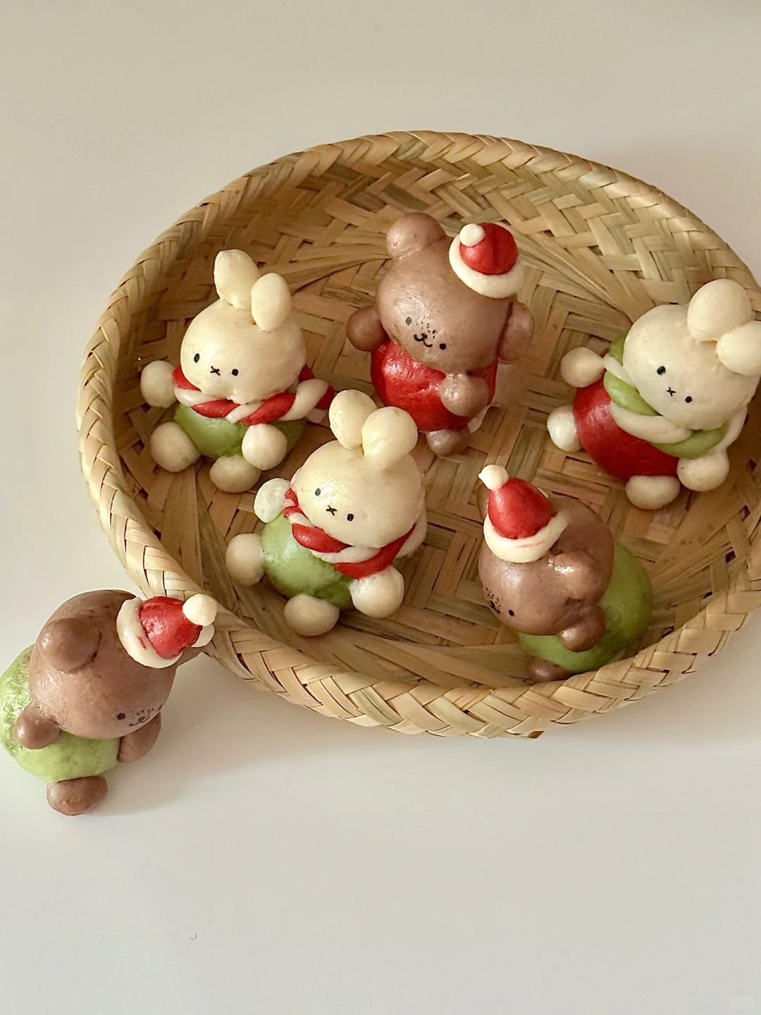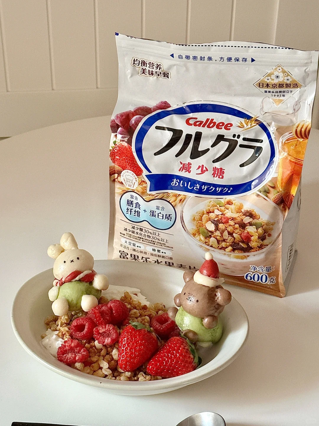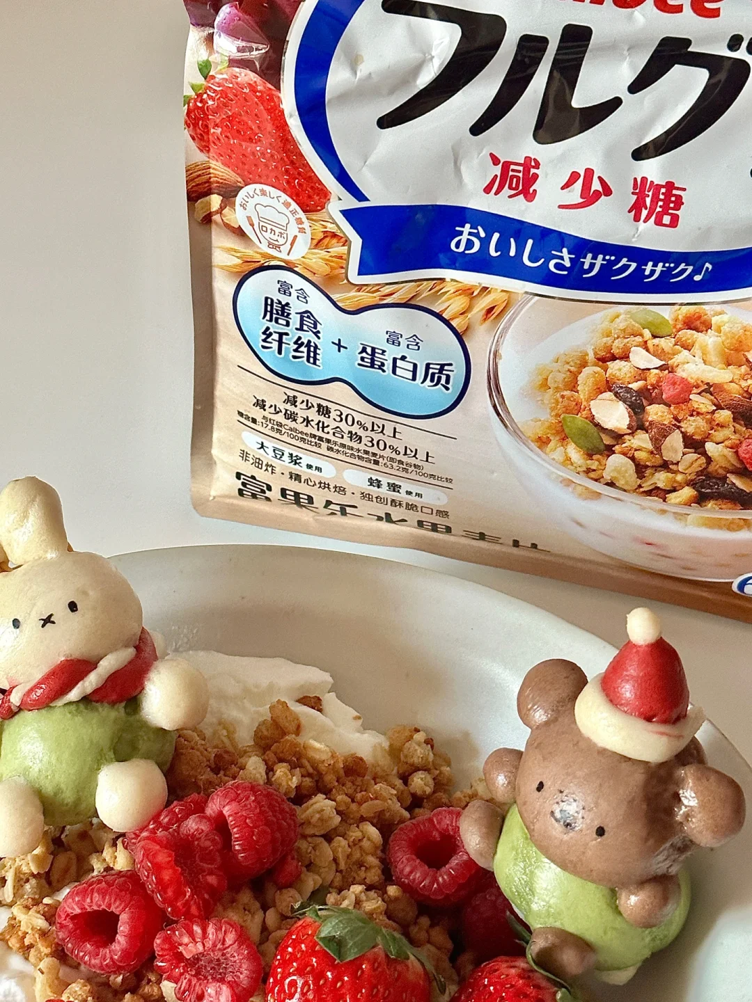 圣诞季到了!来一餐圣诞氛围满满的早点吧![萌萌哒R][两颗心R] 可爱的奶香米菲和鲍里斯穿着圣诞帽和围巾,坐在雪白的希腊酸奶上倚靠着焦黄色的麦片,雪景与麦田的碰撞❄️,别有一番滋味~谁都忍不住想要尝尝吧! 米菲小馒头所需材料: 中筋面粉200g,水110ml,砂糖5g,酵母3g 制作步骤: ①常温水化开酵母,一起倒入面粉揉匀 ②醒发一小时左石,排气揉光滑 ③按照图示分出面团调色,每个70g左右 绿色:抹茶粉 红色:红曲粉➕适量红色色素 棕色:可可粉 ④按照身体15g,头13g左右捏出形象,先捏身子再安装头和其余耳朵手手脚丫,可以抹水粘合(米菲耳朵用龙须挂面穿入固定) ⑤制作好的馒头需要再醒发 5-10分钟左右。冷水上锅,上汽后再蒸15分钟 ⑥蒸熟的馒头用可食用色素笔画出表情即可! 迷你可爱的香香馒头搭配好吃的卡乐比富果乐减少糖水果麦片,快试试吧!多种谷物搭配多种果干,酸甜香脆,每一颗麦片都如阳光般灿烂,独特健康的烘焙工艺,让它们酥脆不失美味,瞬间唤醒清晨的味蕾,犹如在舌尖跳起了脆爽的舞蹈~低GI的麦片更适合控糖仙女们的需求哦![哇R][哇R] 快来试试这份快手可爱的圣诞早餐吧!![偷笑R]