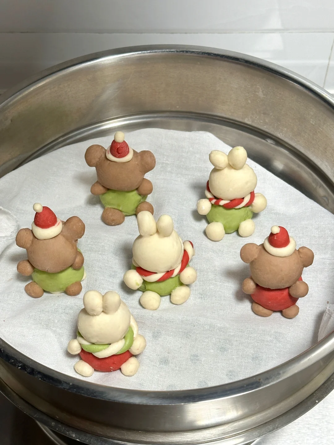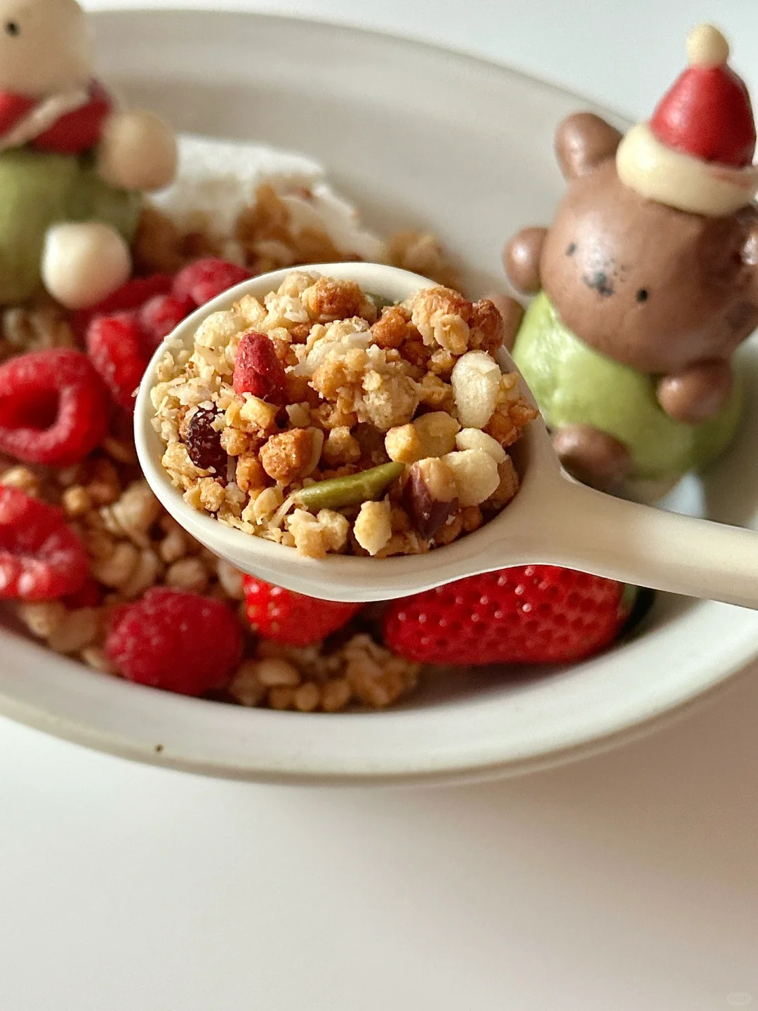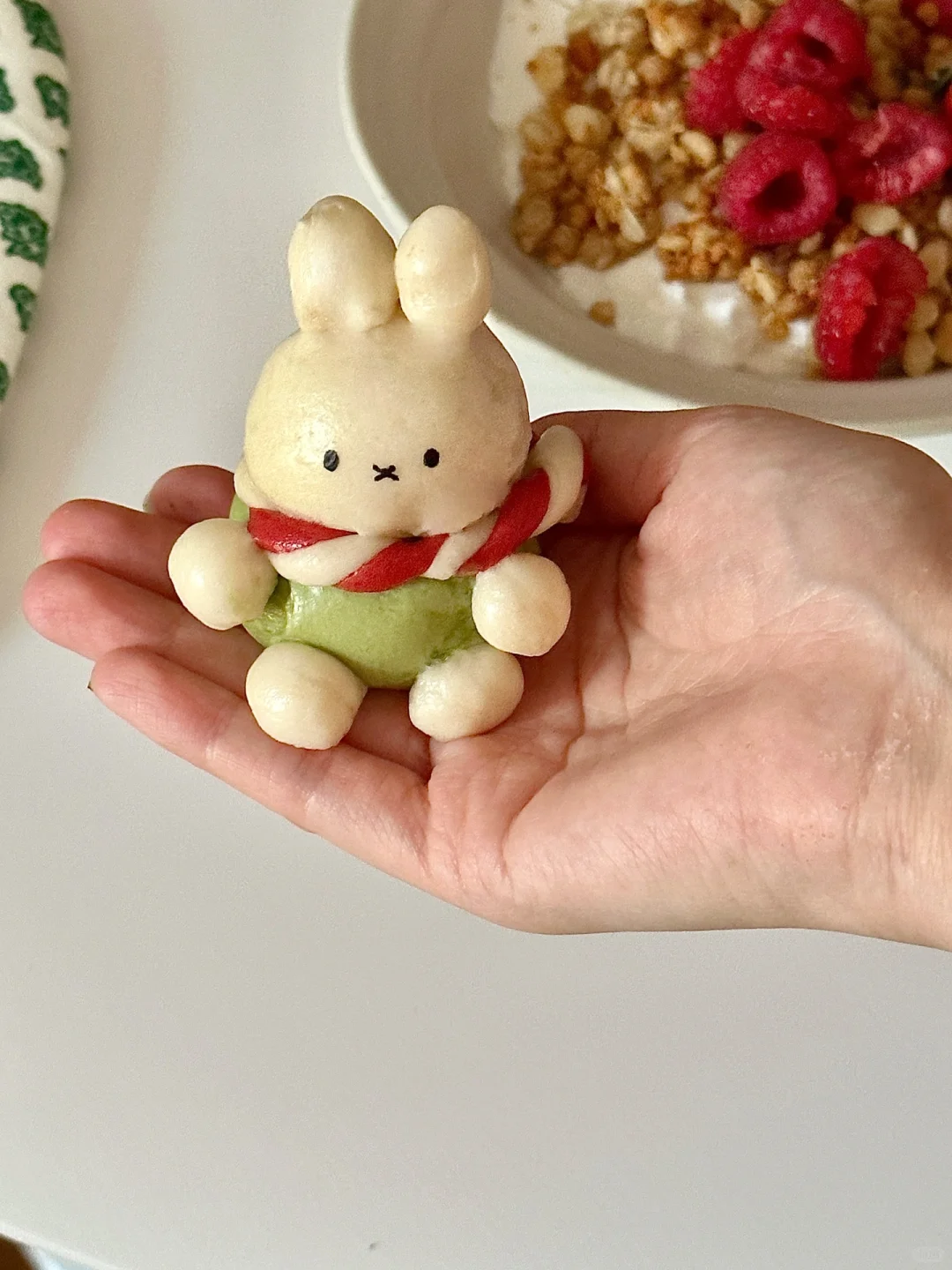 圣诞季到了!来一餐圣诞氛围满满的早点吧![萌萌哒R][两颗心R] 可爱的奶香米菲和鲍里斯穿着圣诞帽和围巾,坐在雪白的希腊酸奶上倚靠着焦黄色的麦片,雪景与麦田的碰撞❄️,别有一番滋味~谁都忍不住想要尝尝吧! 米菲小馒头所需材料: 中筋面粉200g,水110ml,砂糖5g,酵母3g 制作步骤: ①常温水化开酵母,一起倒入面粉揉匀 ②醒发一小时左石,排气揉光滑 ③按照图示分出面团调色,每个70g左右 绿色:抹茶粉 红色:红曲粉➕适量红色色素 棕色:可可粉 ④按照身体15g,头13g左右捏出形象,先捏身子再安装头和其余耳朵手手脚丫,可以抹水粘合(米菲耳朵用龙须挂面穿入固定) ⑤制作好的馒头需要再醒发 5-10分钟左右。冷水上锅,上汽后再蒸15分钟 ⑥蒸熟的馒头用可食用色素笔画出表情即可! 迷你可爱的香香馒头搭配好吃的卡乐比富果乐减少糖水果麦片,快试试吧!多种谷物搭配多种果干,酸甜香脆,每一颗麦片都如阳光般灿烂,独特健康的烘焙工艺,让它们酥脆不失美味,瞬间唤醒清晨的味蕾,犹如在舌尖跳起了脆爽的舞蹈~低GI的麦片更适合控糖仙女们的需求哦![哇R][哇R] 快来试试这份快手可爱的圣诞早餐吧!![偷笑R]