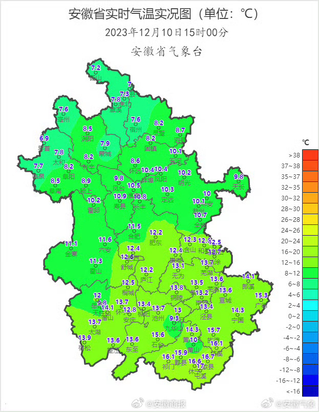 【#安徽淮北地区降温已超14度#】受冷空气影响,午后我省降温显著,大部地区较昨日同一时段降温幅度超过8℃,其中淮北地区普遍降温幅度超过14℃,截至15:00,全省共57个县(区)发布了寒潮蓝色或黄色预警,预计今明两天全省有较明显降水过程,气温持续下降,公众请及时增添衣物,预防感冒,多关注道路湿滑对交通出行的不利影响。(安徽气象)#安徽刚刚发布寒潮蓝色预警# #安徽12号早晨最低温零下4℃#