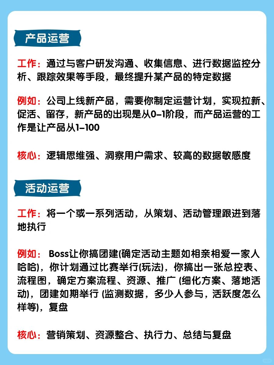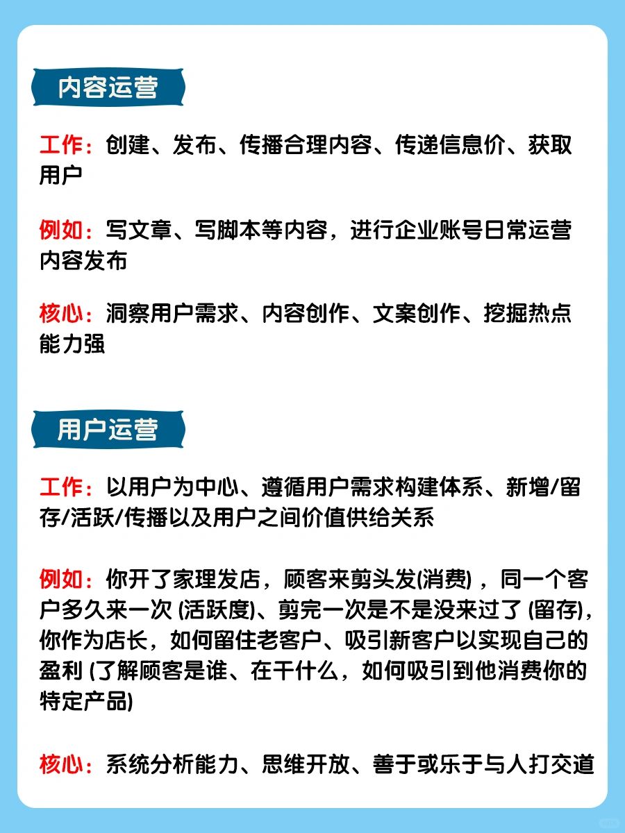 🔔随着就业形势的不理想,越来越多的同学将自己的就业方向对准互联网大厂 👉运营岗,作为大厂的几大类岗位之一,相比于战略产品岗位的门槛较低,一般没有其他条件的约束,是每一位同学都可以去尝试的,薪资也是相对很可观的。 🔆无论是校招还是找实习,我们都会发现有各种各样的“某某运营”,很多同学有时候根本不了解这个岗位的具体岗位职责就去投递,结果相比也一定是不如意的。 🌟任何岗位我们都要提前了解是否适合自己,以及能否胜任。 ✅以上是几种运营岗位的岗位介绍,小伙伴们抓紧码住,提前准备起来吧‼