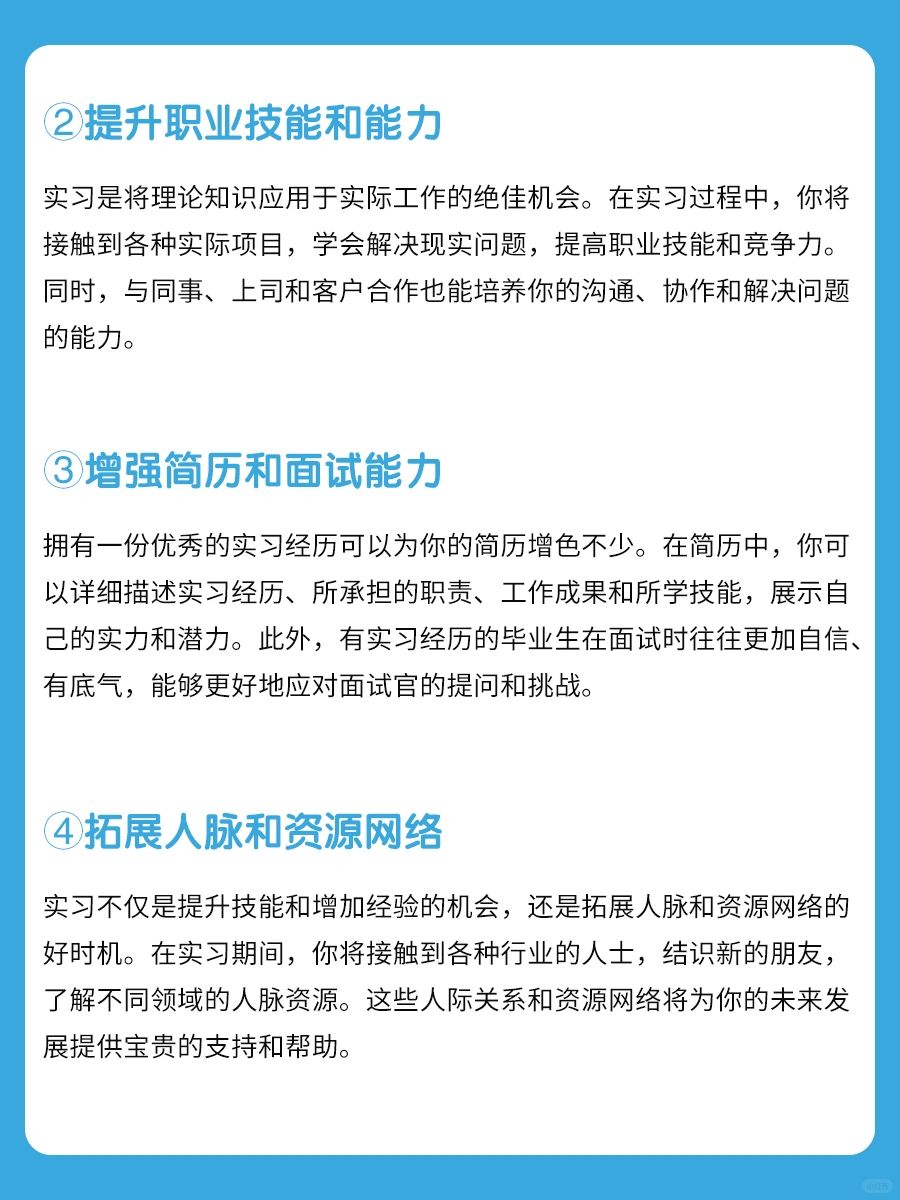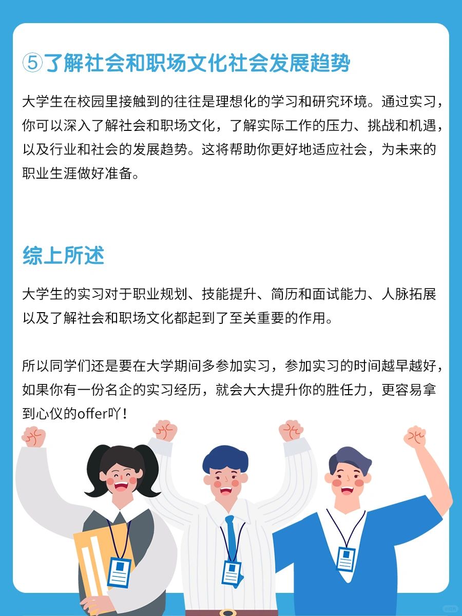 ❣大学生的实习对于职业规划、技能提升、简历和面试能力、人脉拓展以及了解社会和职场文化都起到了至关重要的作用。
