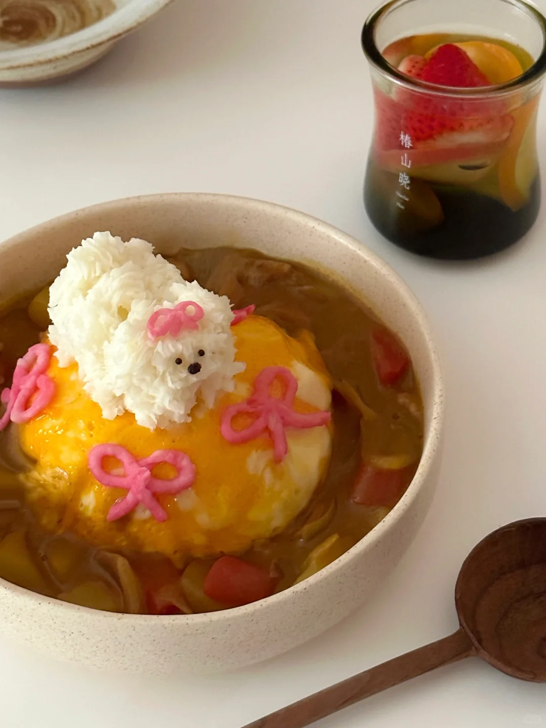冬天做一份家庭自制咖喱蛋包饭,搭配煮一杯水果青梅酒,暖暖的再好不过啦~[两颗心R][萌萌哒R][萌萌哒R] 咖喱饭所需材料: 洋葱,土豆,胡萝卜,咖喱块,去皮鸡腿肉 制作步骤: ①热油下锅,洋葱炒香,加入鸡腿肉块炒变色,加入剩余蔬菜 ②翻炒片刻加入热水,煮五分钟 ③加入咖喱块搅拌均匀,关火 ④鸡蛋打散,平底不粘锅中小火煎蛋饼 ⑤盘子中扣入米饭,米饭上盖上蛋饼,周围淋上咖喱即可 ⑥山药去皮蒸熟,加入适量水捣成泥,放在裱花袋中挤出小狗的形象,粉色蝴蝶结🎀是加入适量仙人掌果粉调色 水果青梅煮酒: 椿山晓青梅酒,橙子🍊切片,苹果🍎切片,草莓🍓,黄冰糖适量 制作步骤: ①锅中加入适量水,倒入一杯青梅酒,加入所有水果 ②关火,加入黄冰糖搅拌均匀 ③倒入杯中装饰即可饮用 近期种草的这款椿山晓青梅酒,口感醇香清甜,采用纯手工采摘的新鲜青梅浸泡,有着浓郁的梅香,古法酿造,果香十足,入口轻盈。包装也很戳中小心思哦,揭盖就变成一盏有东方美学色彩的酒杯,喝出满满的仪式感!