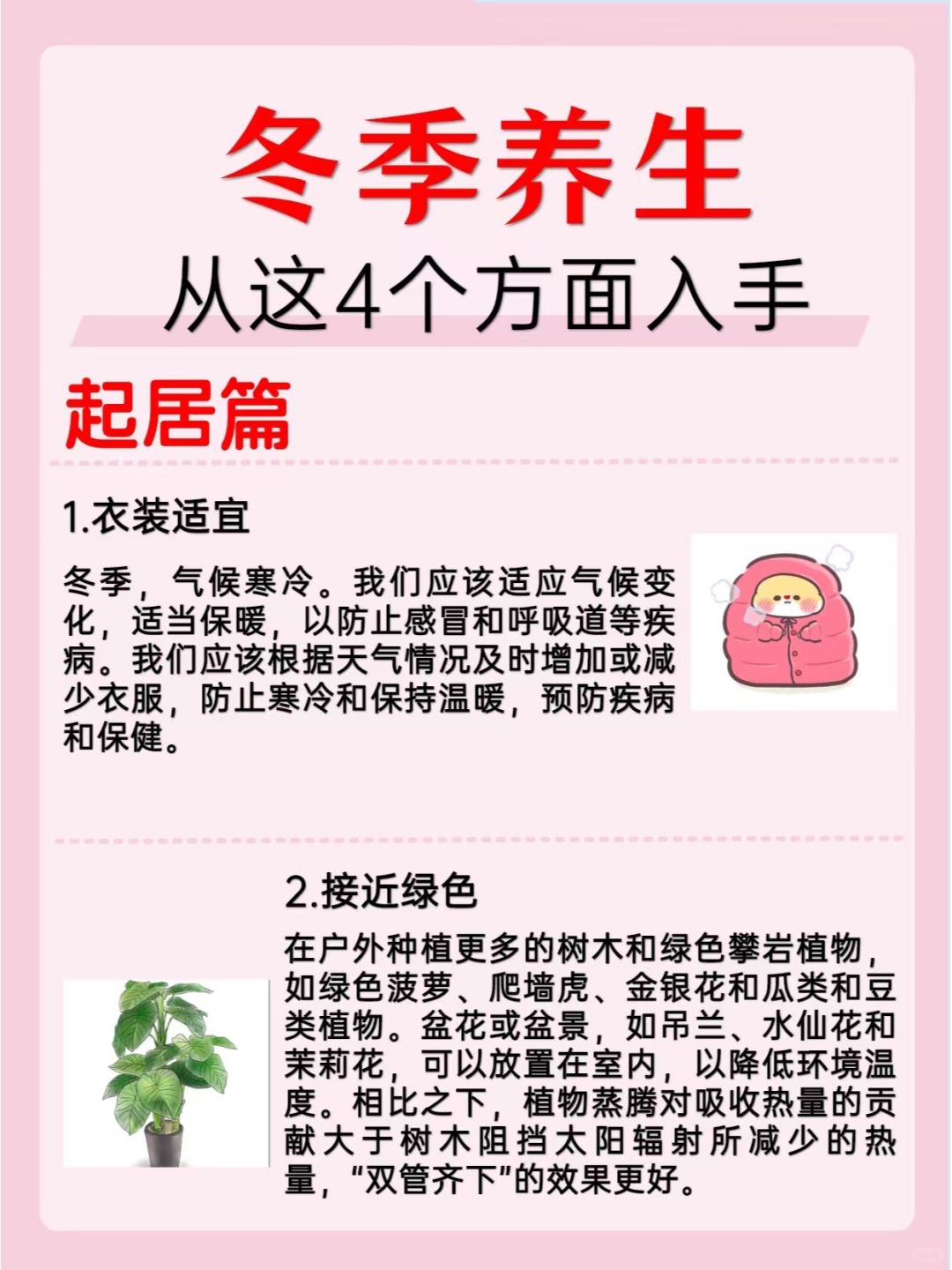 冬季要注意保暖,多穿衣服,避免感冒。保持室内空气流通,避免长时间待在密闭环境中。适当进行户外运动,增强身体免疫力。