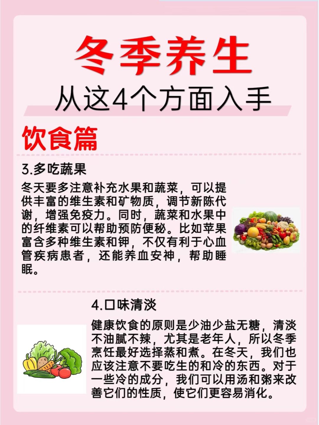 冬季饮食应以温补为主,多吃富含蛋白质、维生素和矿物质的食物,如瘦肉、鱼类、蔬菜、水果等。同时要少吃生冷食物,避免刺激肠胃。