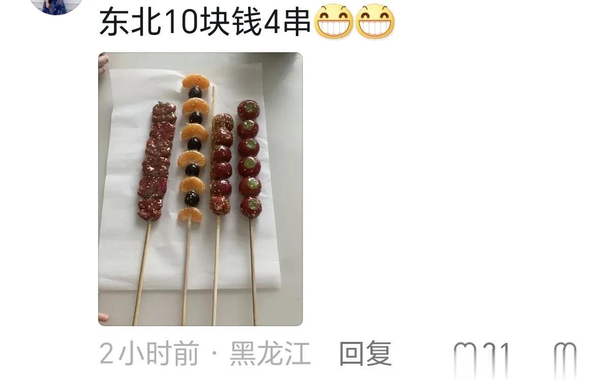 东北女孩在成都,手里拿着一串糖葫芦说:“这是在成都8块钱一串的糖葫芦,在我大东北能买4串”。 网友:宝,你多久没有回东北了,8元最多能买2串。 黑龙江网友:东北10块钱4串[呲牙][呲牙]
