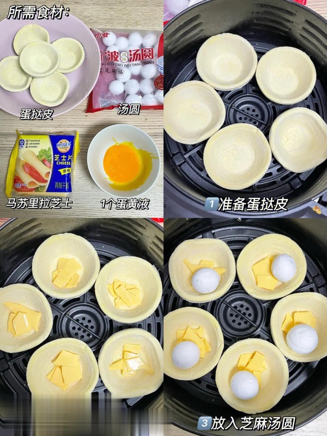 汤圆别再煮着吃了,教你用1个蛋挞加汤圆,外酥里嫩,一口就爆汁! 马上就是正月十五,元宵节了,很多人都开始陆续的准备做汤圆,今年给大家分享这个不一样的神仙吃法! [胡瓜]准备食材:汤圆、蛋挞、芝士,蛋黄 [奋斗]制作方法: 1、准备好的蛋挞皮,拿出来解冻,解冻之前记住取下外壳,以免蛋挞皮破了。 2、取下来后,蛋挞皮中间放上1个汤圆,然后旁边放芝士碎,在将蛋挞皮包裹起来,刷上蛋黄。 3、放到空气炸锅里,时间为20分钟,每10分钟记得翻面即可。 [比心]这个做出的汤圆,巨巨巨好吃,看完元宵节赶紧动手试一试吧,关注@清清爱做菜#柳州美食记录##从今天起记录我的2023#