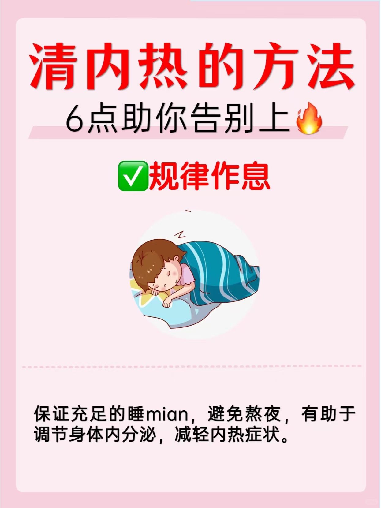 4️⃣规律作息:保证充足的睡眠,避免熬夜,有助于调节身体内分泌,减轻内热症状。
