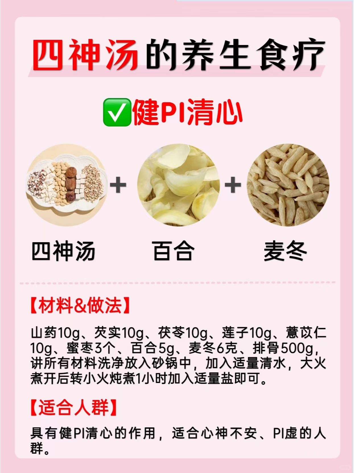 四神汤+百合+麦冬 (具有健PI清心的作用,适合心神不安、PI虚的人群)