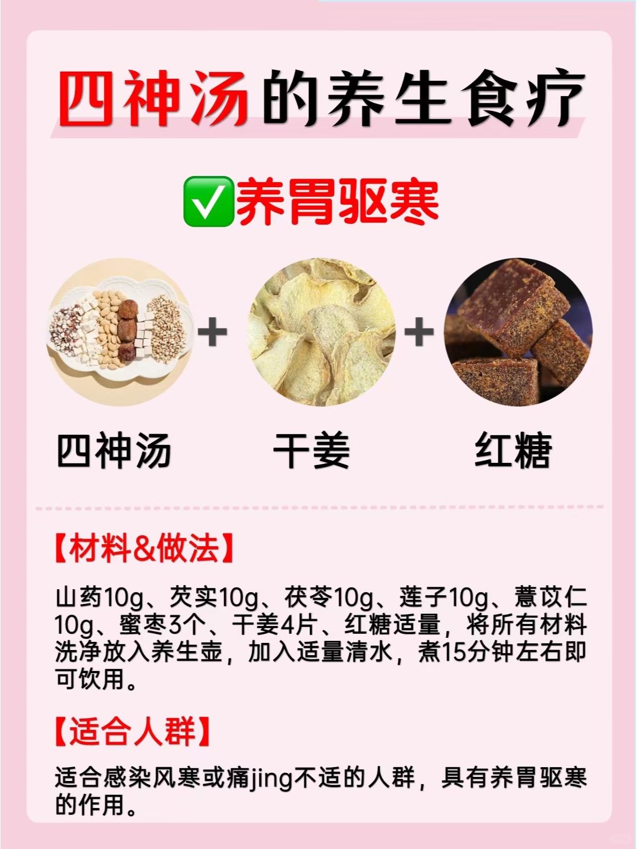 四神汤+干姜+红糖 (适合感染风寒或痛jing不适的人群,具有养胃驱寒的作用)