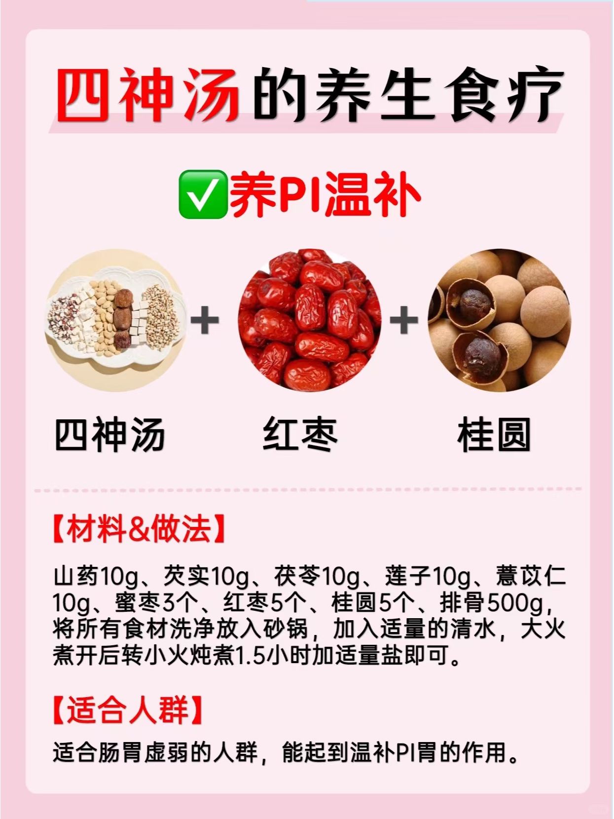 四神汤+红枣+桂圆 (适合肠胃虚弱的人群,能起到温补PI胃的作用)