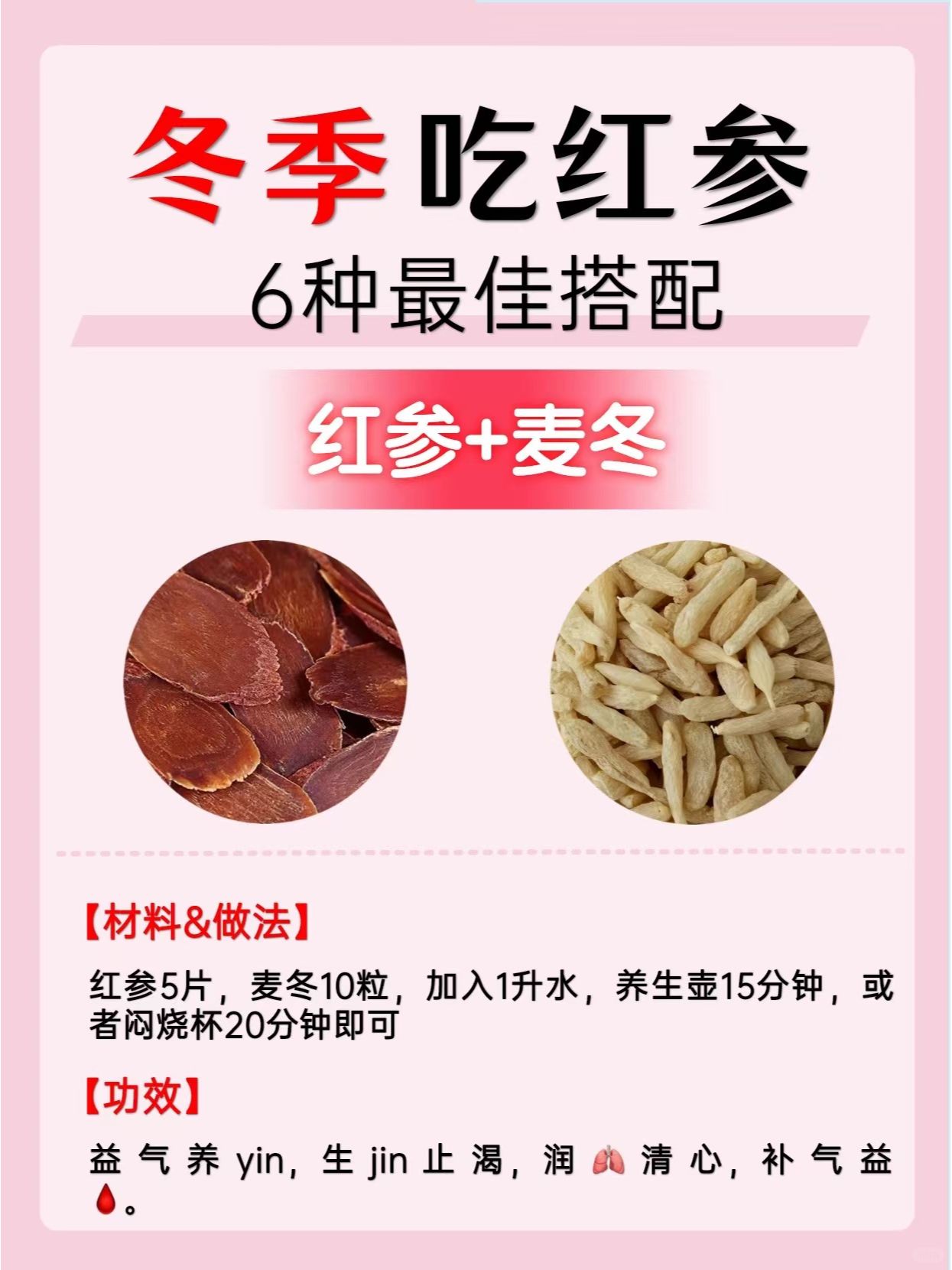 6️⃣红参+麦冬:益 气 养 yin、生jin 止渴、润 🫁 清 心、补 🩸 益 气