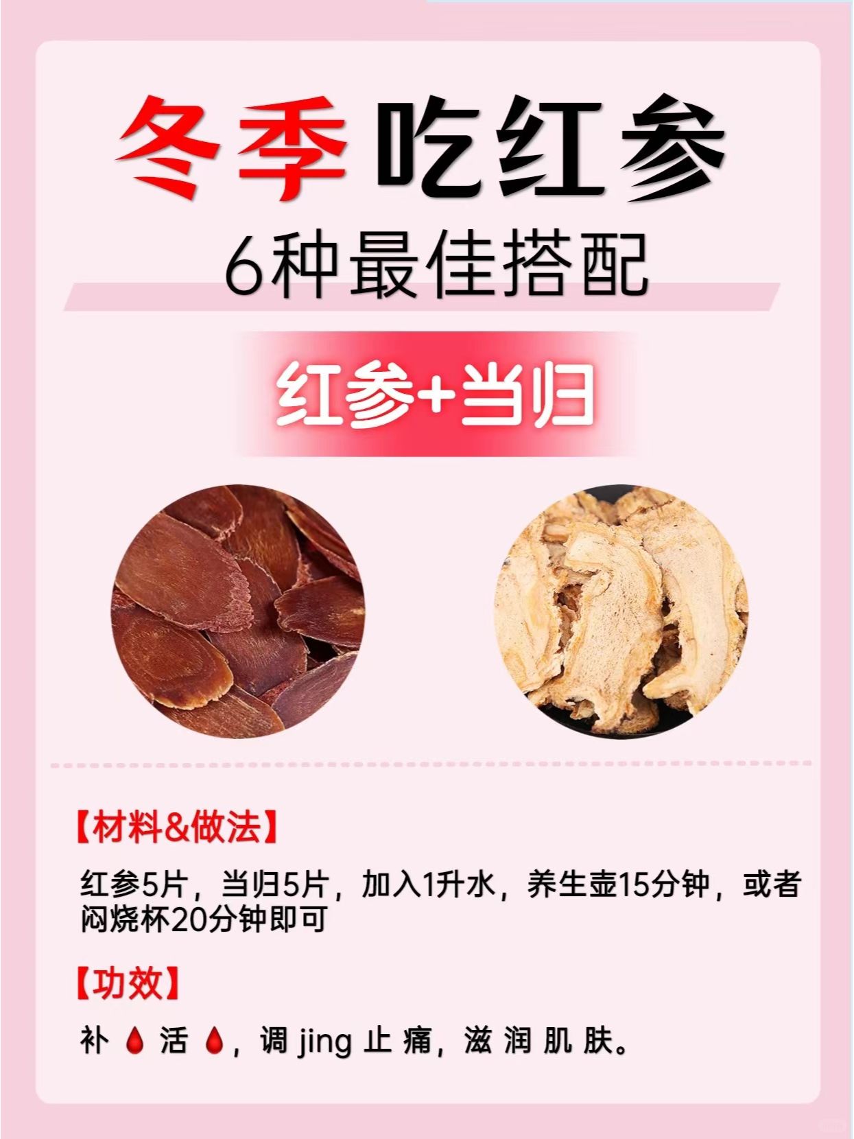 4️⃣红参+当归:补🩸 活 🩸,调jing 止 痛,滋 润 肌 肤。
