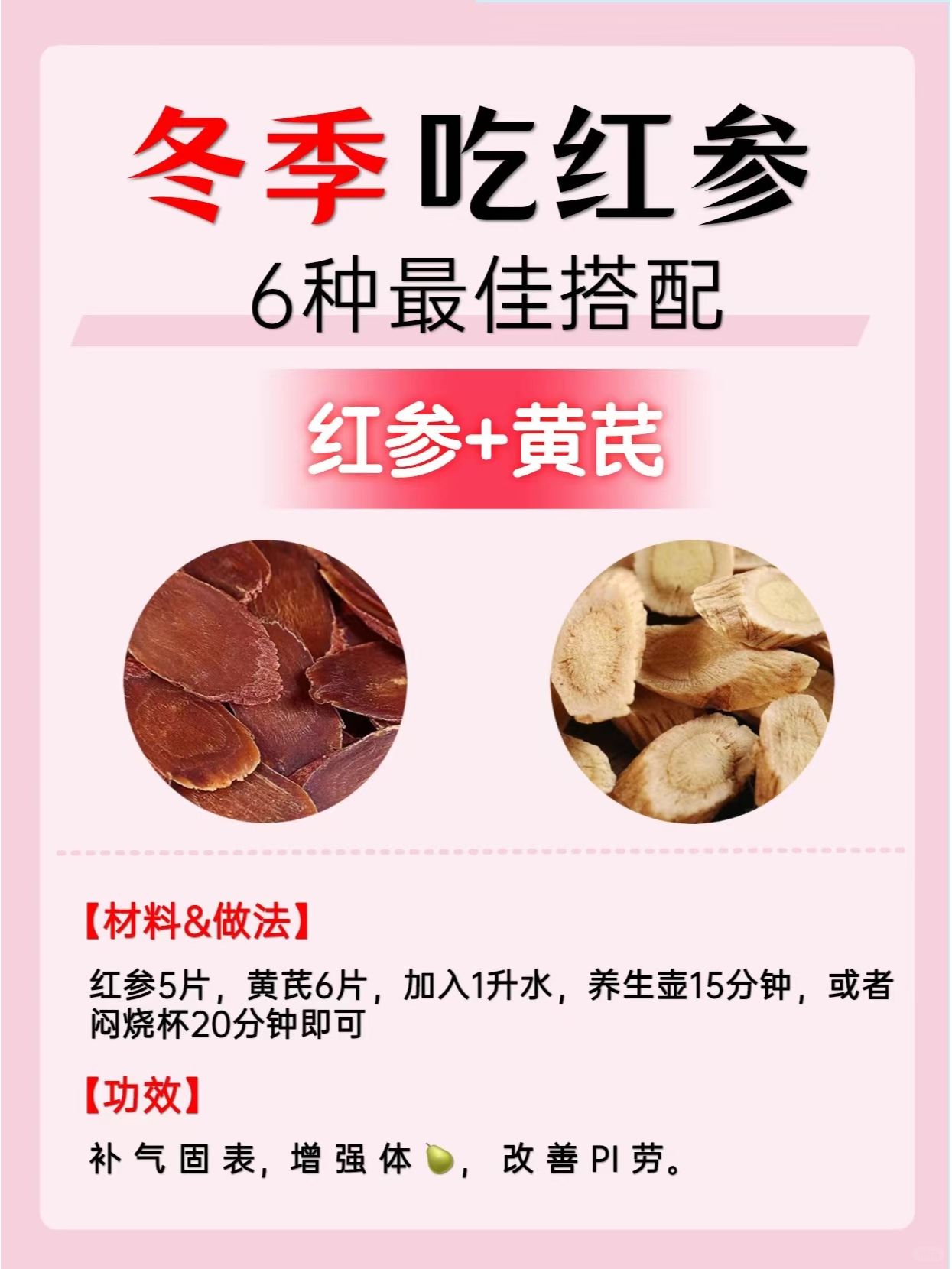 3️⃣红参+黄芪:补 气 固 表,增强 体 力,改 善 PI 劳。
