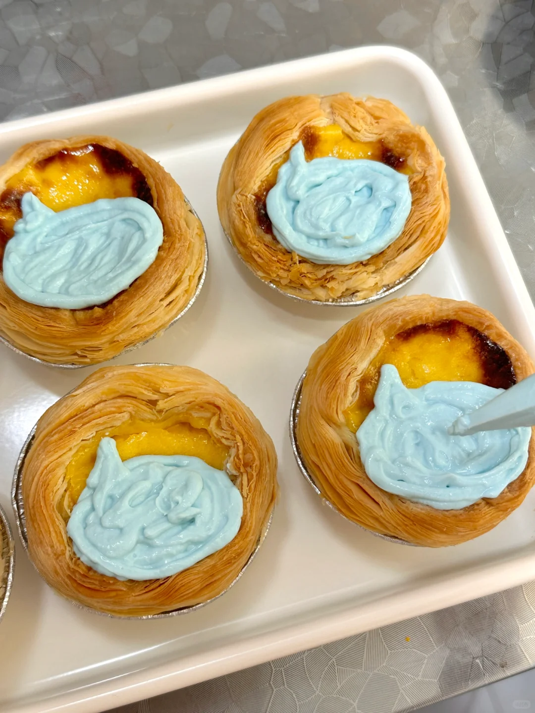 ①调好色的希腊酸奶装入裱花袋,在蛋挞上挤出