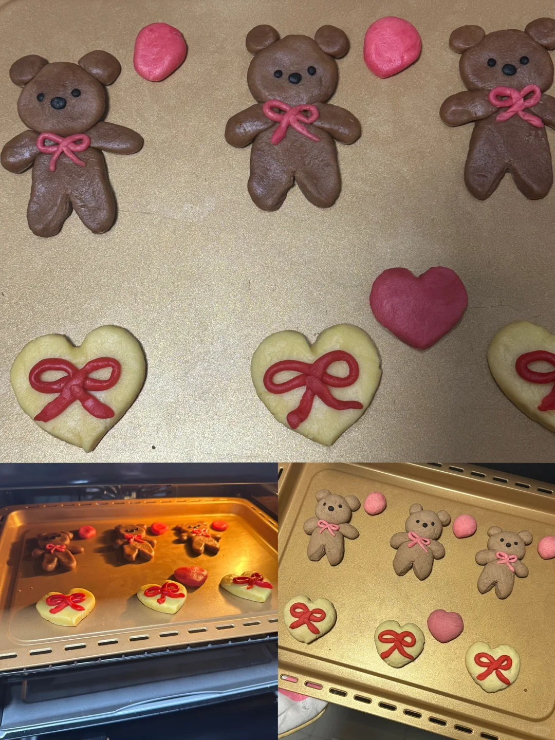 奶香奶香的可可小熊和🎀曲奇 少女心爆棚的时候就想捏一些可爱的[哭惹R][两颗心R]小饼干呀~ 所需材料: 黄油70g,全蛋液30g,低筋面粉 115g, 细砂糖 30g,泡打粉 2g,可可粉,红丝绒色素,仙人掌果粉,竹炭粉,珍珠小糖果 制作步骤: ①室温软化黄油,加入细砂糖,打蛋机搅打蓬松 ②常温鸡蛋液分三次加入(冷藏蛋液容易水油分离不好混和),继续搅打至完全混合 ③筛入低筋面粉泡打粉,揉匀 ④面团染色(¼面团可可粉:棕色小熊 ¼面团不上色:爱心 仙人掌果粉:粉色气球&粉色小熊蝴蝶结 红丝绒色素:蝴蝶结 一丢丢面团竹炭粉:小熊眼睛鼻子) ⑤按照图示捏出小熊等样式(小熊腿是用剪刀剪开然后捏一捏塑型) ⑥烤箱提前预热160°,放入饼干烘烤15分钟左右。 ⑦融化白巧克力挤在蝴蝶结中心,黏上珍珠糖果,待巧克力凝固,小珍珠糖果就固定好啦 很简单哦,快来试试吧[偷笑R]