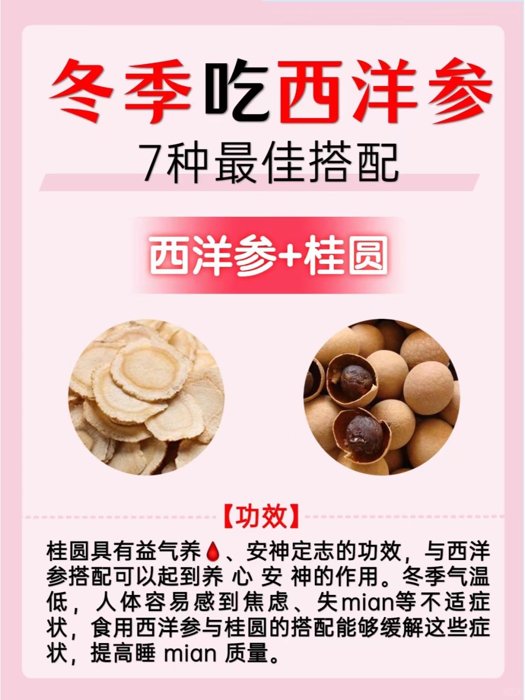 桂圆具有益气养🩸、安 神 定志的功效,与西洋参搭配可以起到养心安 神的作用。冬季气温低,人体容易感到焦虑、失mian等不适症状,食用西洋参与桂圆的搭配能够缓解这些症状,提高睡mian质量。