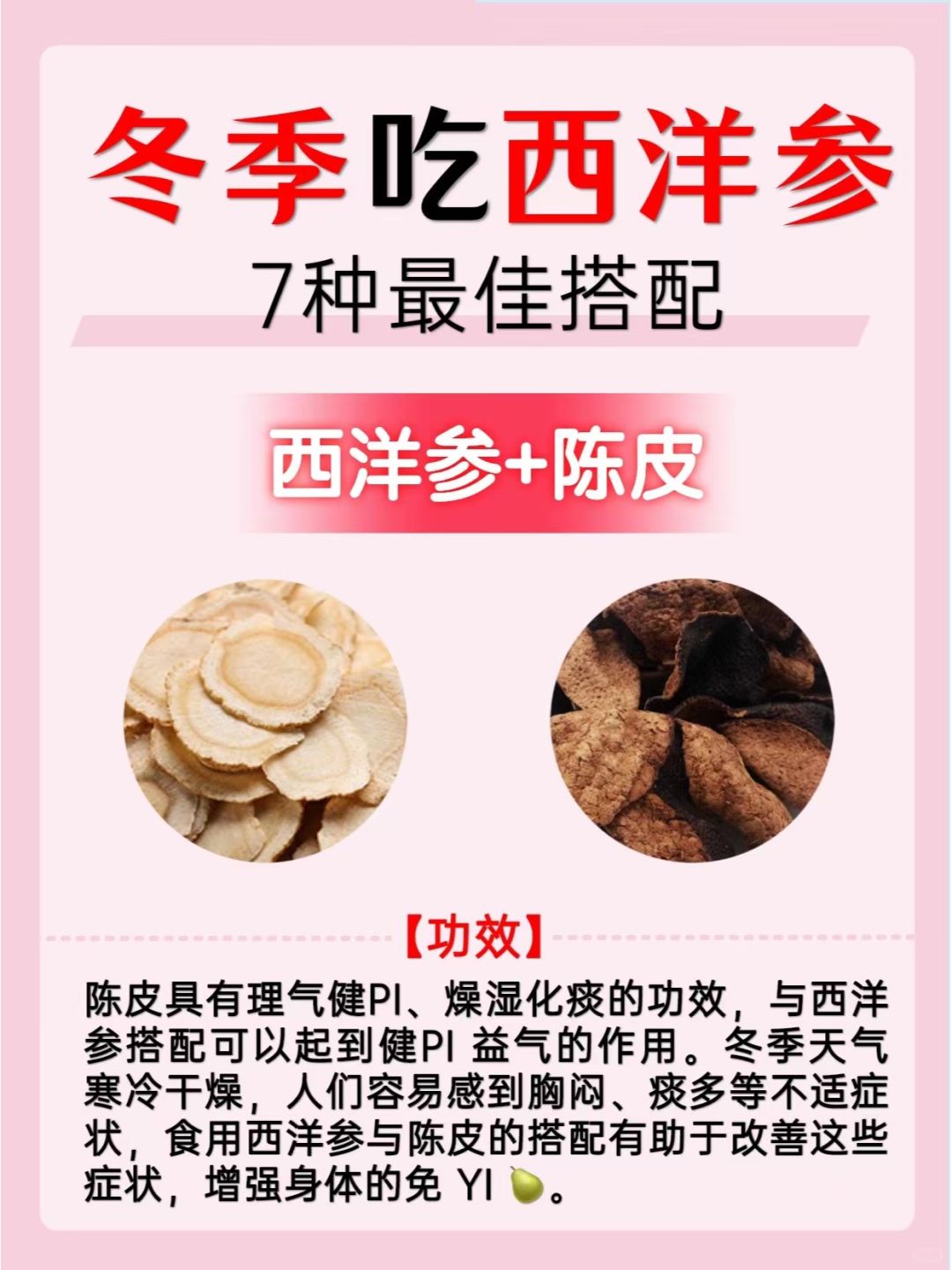 陈皮具有理气健PI、燥湿化痰的功效,与西洋参搭配可以起到健PI益气的作用。冬季天气寒冷干燥,人们容易感到胸闷、痰多等不适症状,食用西洋参与陈皮的搭配有助于改善这些症状,增强身体的免 YI 🍐。